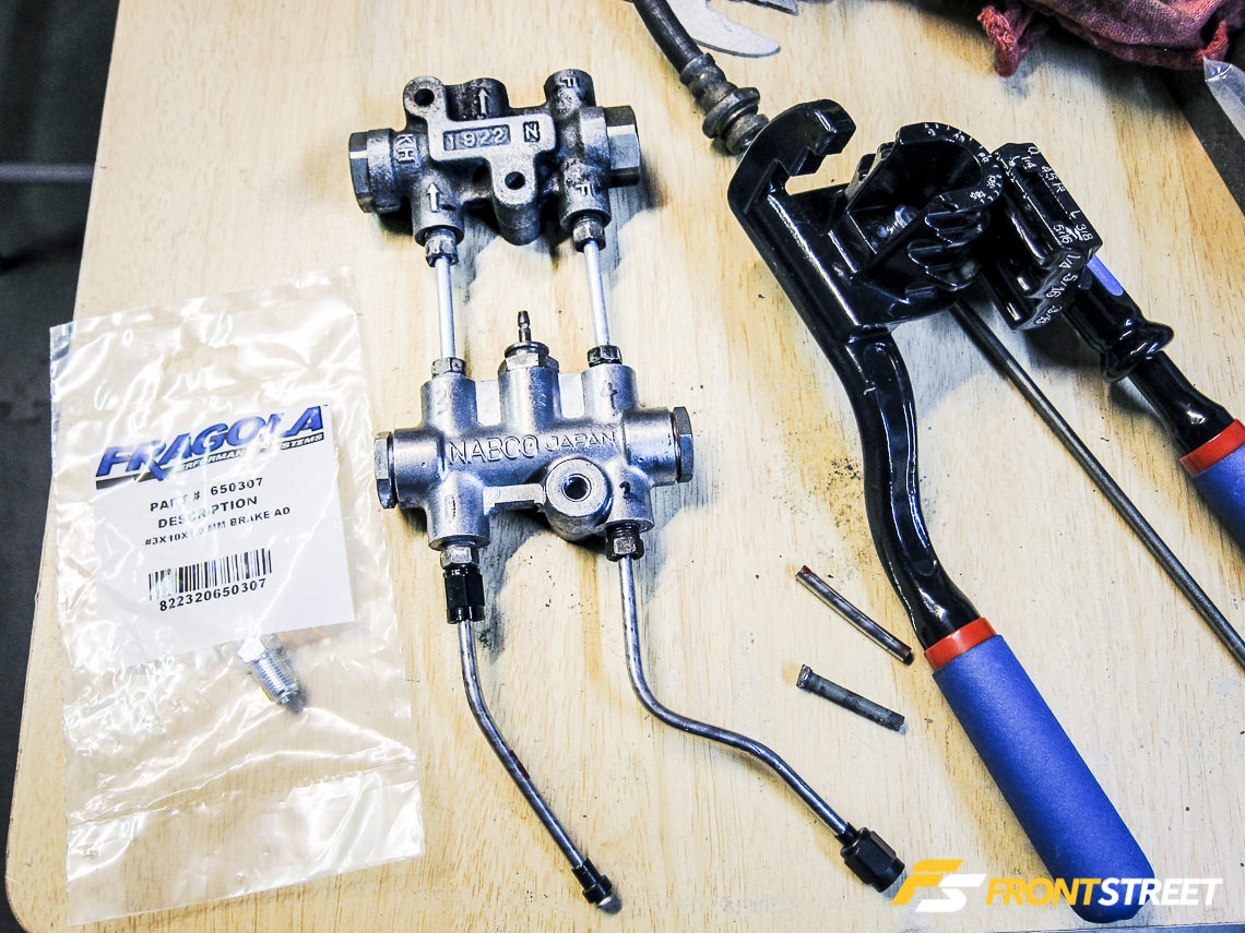 A trip to the junkyard landed a hard-to-find 15/16-inch master brake cylinder pulled from a 280ZX. This master cylinder is a key component when upgrading both front and rear disc brakes for any 510 and is a direct bolt-on when using 280ZX struts and an aftermarket rear brake caliper adapter plate. We also coaxed the owner to throw in a set of rear brake calipers and proportioning valve which served as a critical component when upgrading to disc brakes on all four corners.