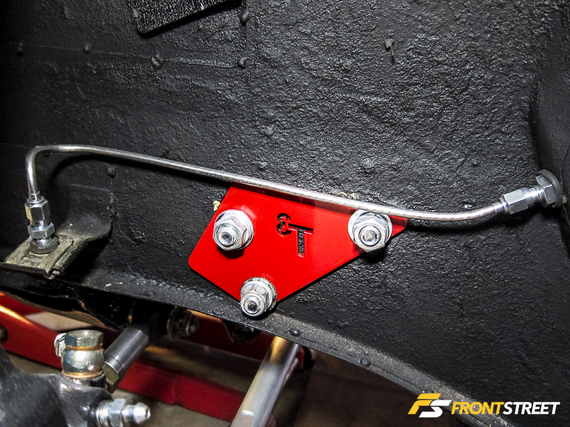 Installing the steering kit required drilling the knuckles and control arm holes to 5/8-inch. A set of Techno Toy Tuning roll center adjusters were installed in anticipation of eliminating bump steer, a common occurrence associated with the 510 and lowered cars in general. We also picked up the company’s transmission mount kit to accommodate our SR transmission.