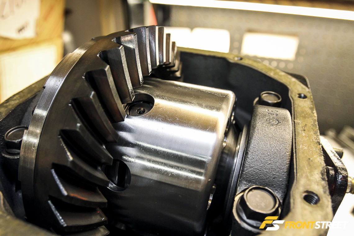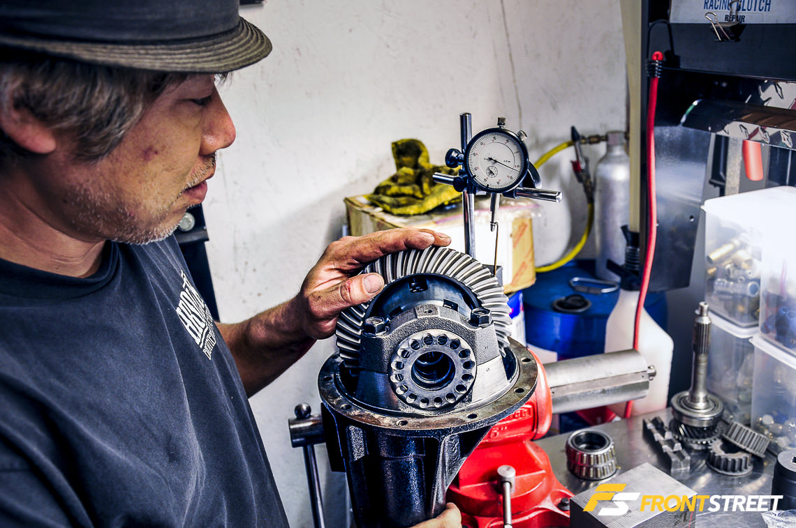 Finding a CLSD (clutch limited slip differential) in a 10 mm gear bolt design for our R200 long nose was nearly impossible. To remedy the situation, we decided to purchase a brand new unit from Kaaz USA that was designed for a Nissan S13 R200 short nose. The Super Q LSD 1.5-way unit comes with special clutch packs already prepared with WPC treatment for smooth engagement, improved heat dissipation, and longer gear life.