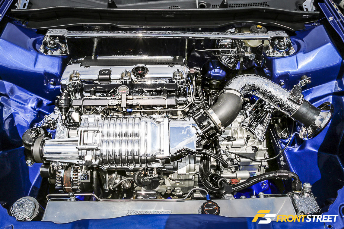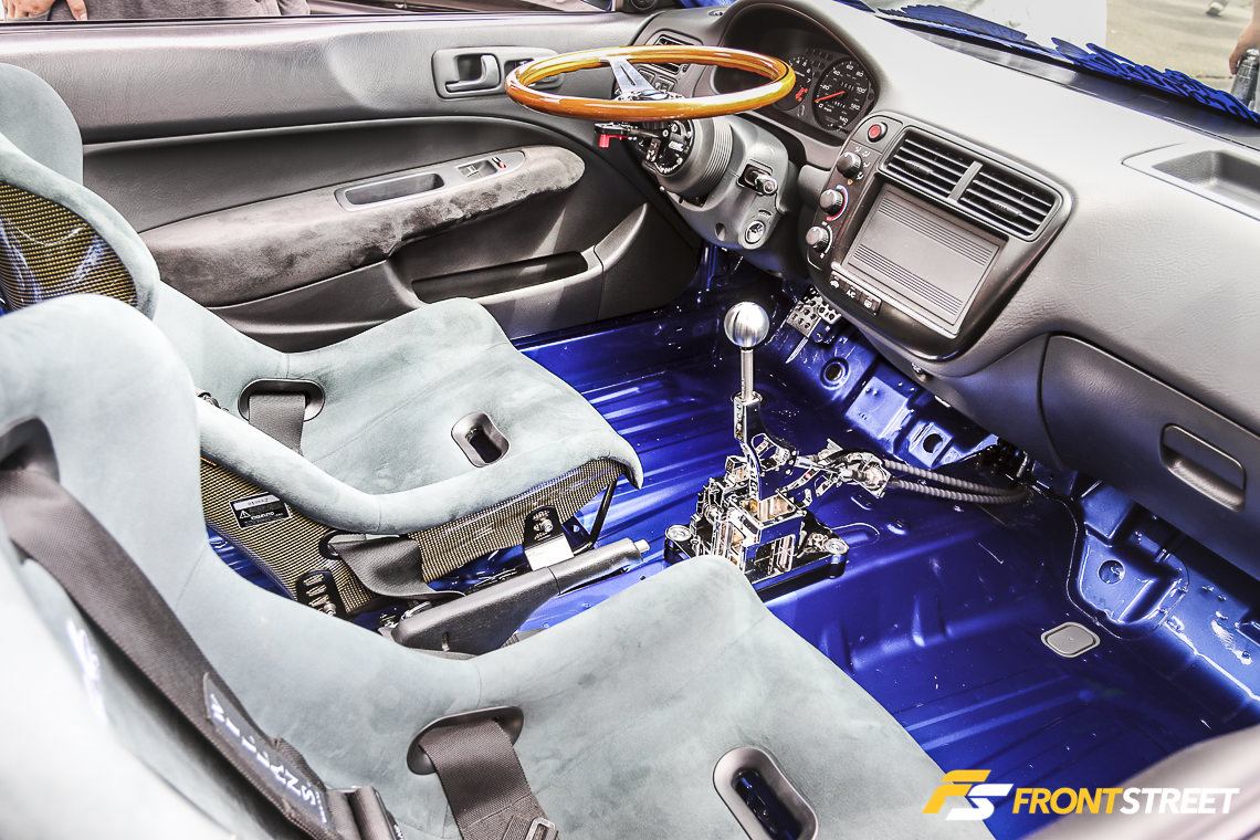 Interior modifications include a pair of ICB Pursuit MKI Kevlar-backed seats, Willans harnesses, Nardi steering wheel, and a custom fully chromed K-Tuned billet shifter.
