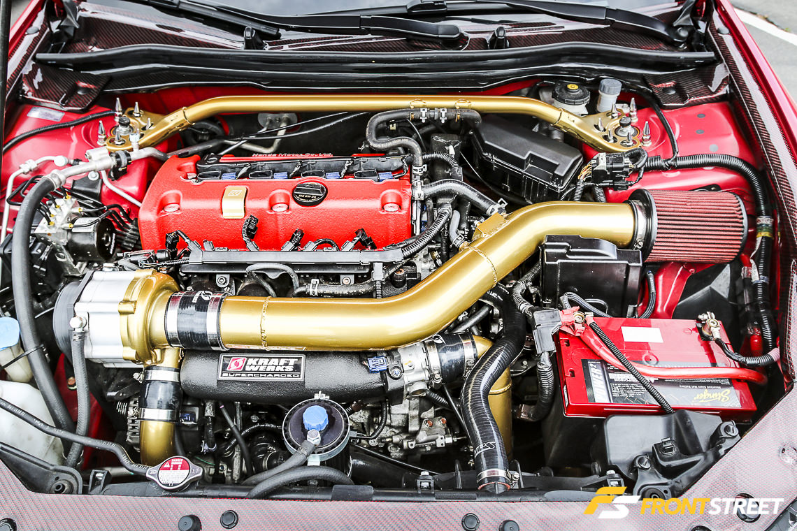 The Integra has been going through a series of modifications and changes, Currently, the original B18A1 engine has been replaced with a K24A4 CRV engine with an ’04 Civic Si 5-speed transmission, mounted using Hasport DAK2 dual height mount kit with 72A urethane and solid rear mount. A Jackson Racing Civic Si supercharger delivers additional boost while a Hondata K Pro controls fuel and ignition timing. Currently, the engine delivers a modest 280 whp, but future plans call for a Jackson Racing K-series racing supercharger kit with Rotrex supercharger and K-Tuned big tube header. The target is 400 to 450 HP with this setup.