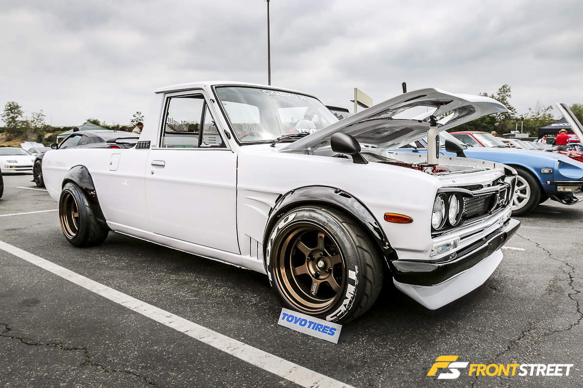 Dubbed “Hakotara”, this hybrid Datsun has quickly risen to import car stardom in a short time. Most notably, the ’74 Sunny pickup truck with its Hakosuka Skyline GTR front end was showcased recently on Jay Leno’s Garage. With over 400 wheel horsepower on tap, the SR20DET-powered Frankenstein was custom-fabricated from the suspension to the exterior work, with the help of Design Craft Fabrication and Chasing Js.