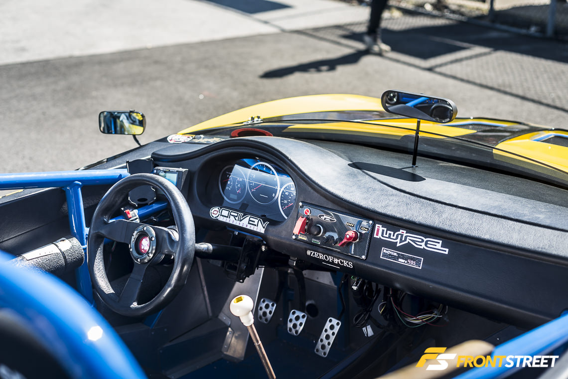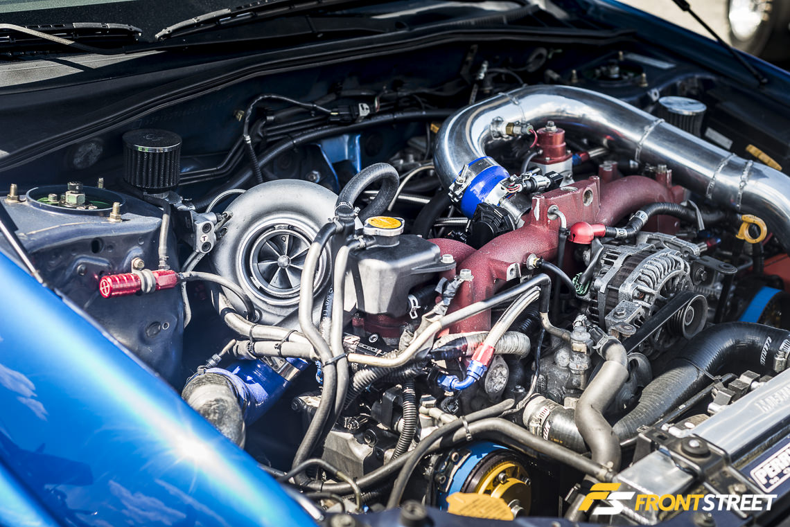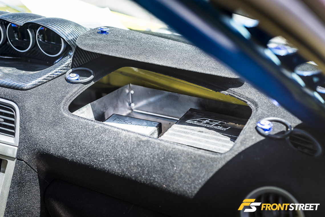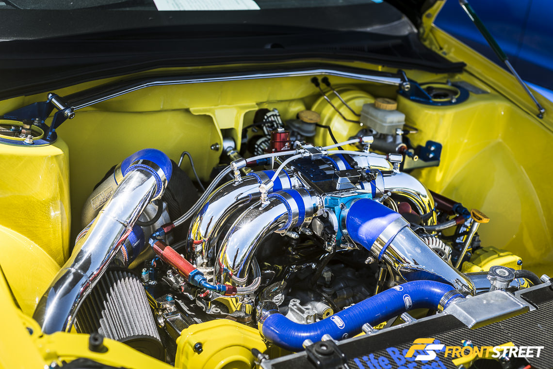 No Limit Motorsport brought out this white Hawkeye with its hood removed. This showed the attendees its rotated Garrett turbocharger, Process West intake manifold, and custom hood-exit exhaust setup. The polished three-piece CCW Classic wheels on the exterior and bright red Bride seats/panels on the interior completed its modified package.