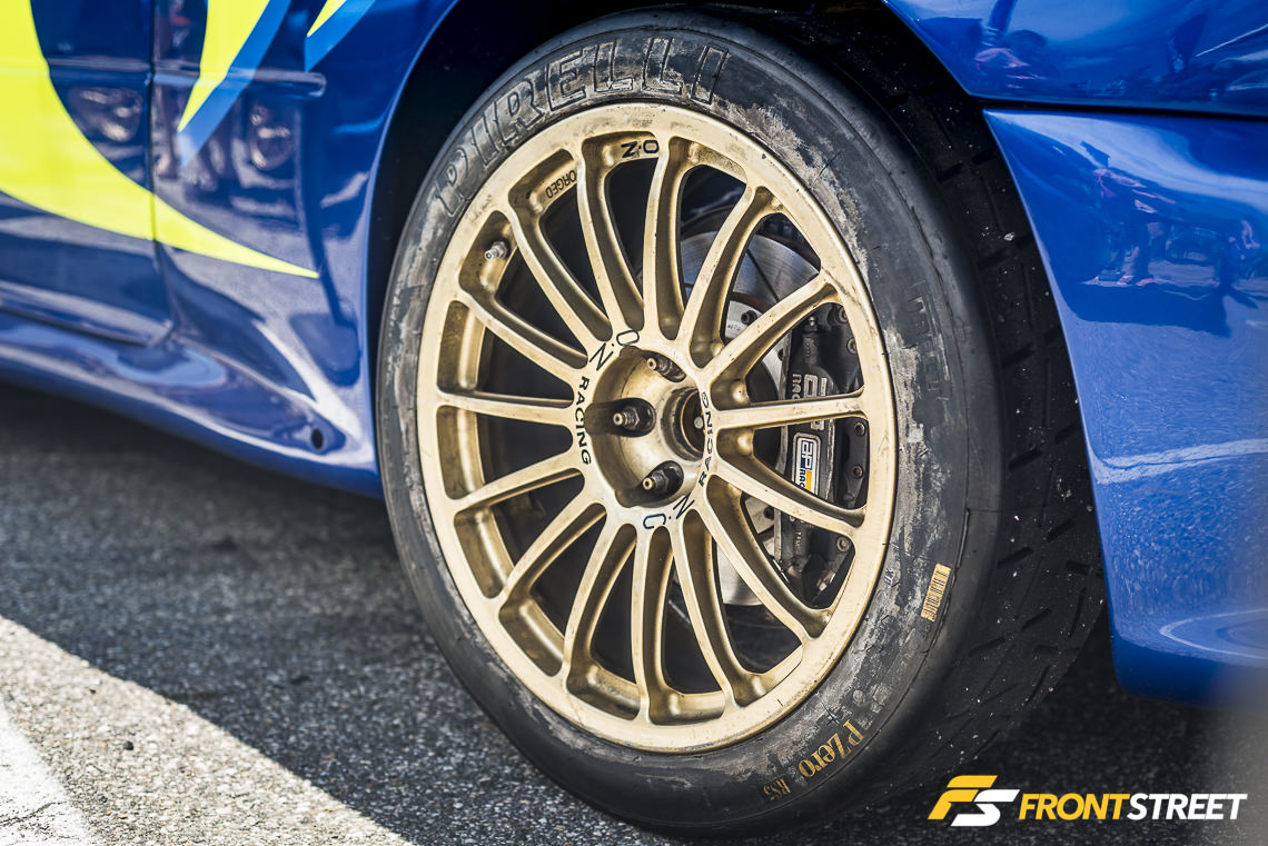 RavSpec consistently represents the Subaru community in style with the cars outside of their booth, including this blue Blobeye STI equipped with a rare and discontinued Cusco front lip and wide Weds Maverick wheels mounted over an Endless big brake kit inside the fenders.