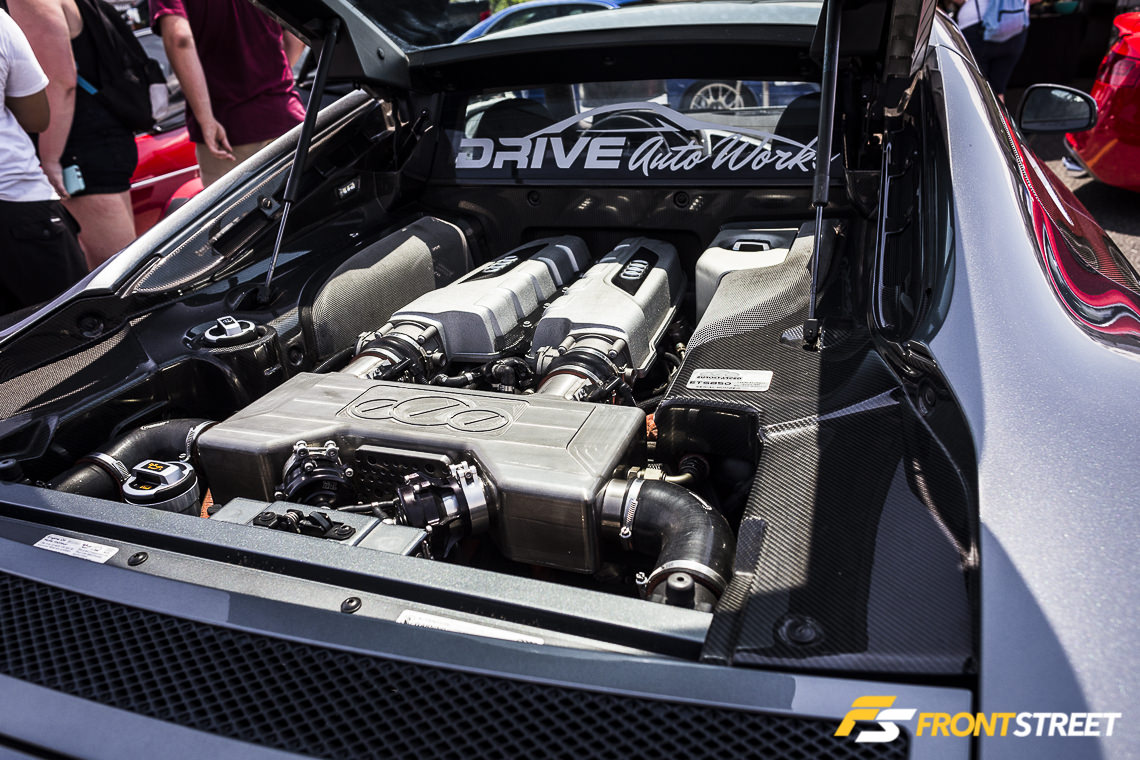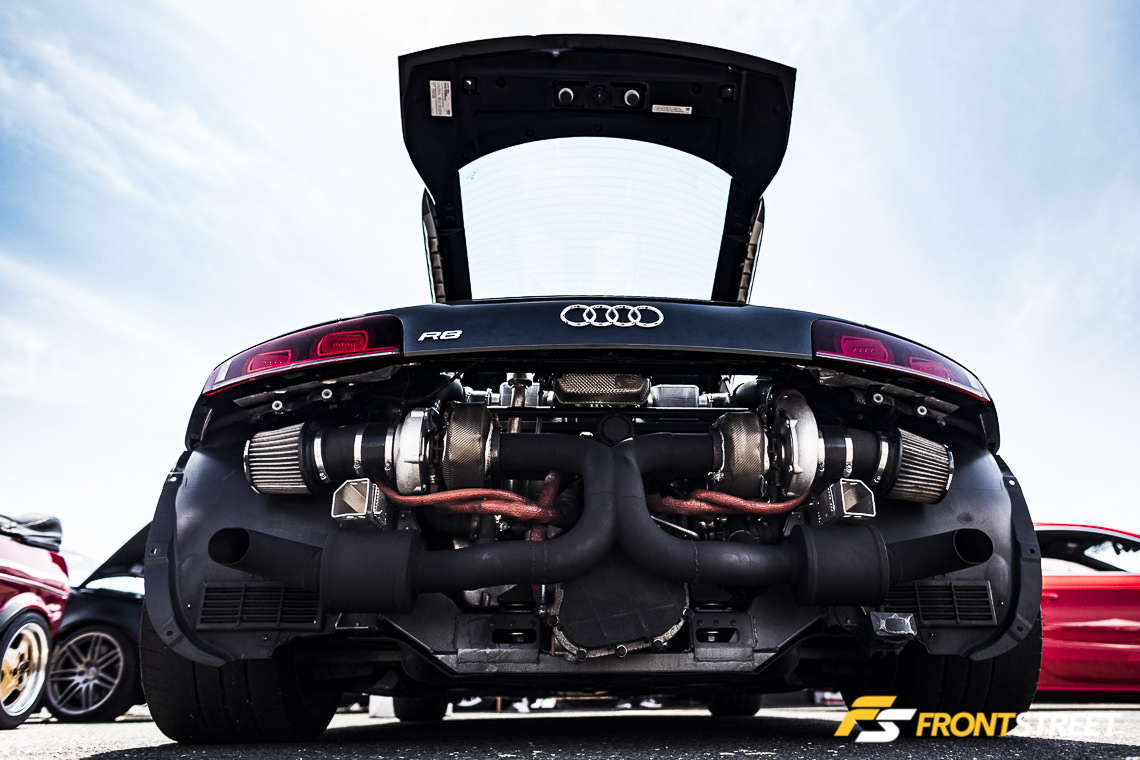 This R8, although it shares its V10 engine platform with the Lamborghini Gallardo, has one element the Gallardo does not – the twin-turbo kit that’s been fitted under the rear bumper. Unfortunately I could not locate the Drive Auto Works gang to find out how much power the turbochargers added, but there’s no doubt the R8’s performance has been substantially improved by their installation. I love the fact that they’re hidden under the bumper cover; I would not want to roll up next to his beast on the highway.