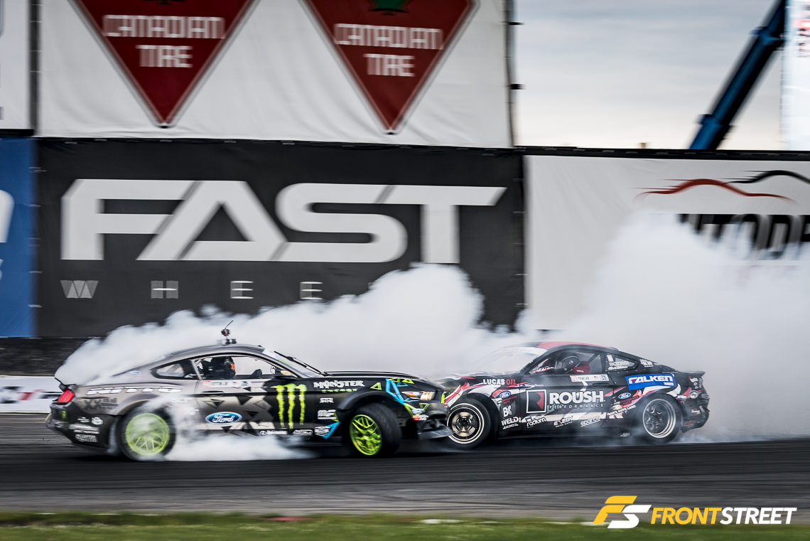 The all-Mustang combination of Justin Pawlak in his Roush Performance Ford Mustang, and Vaughn Gittin, Jr., allowed the combined 2,000 horsepower of Ford V8 engines to roar through the Canadian atmosphere – until Pawlak made contact with Gittin, forcing a spin in the latter stage of their run. Although it seemed like Pawlak was able to carry more speed than Gittin through the turn, the judges deemed the contact to be Pawlak’s fault and Gittin progressed onto the next round.