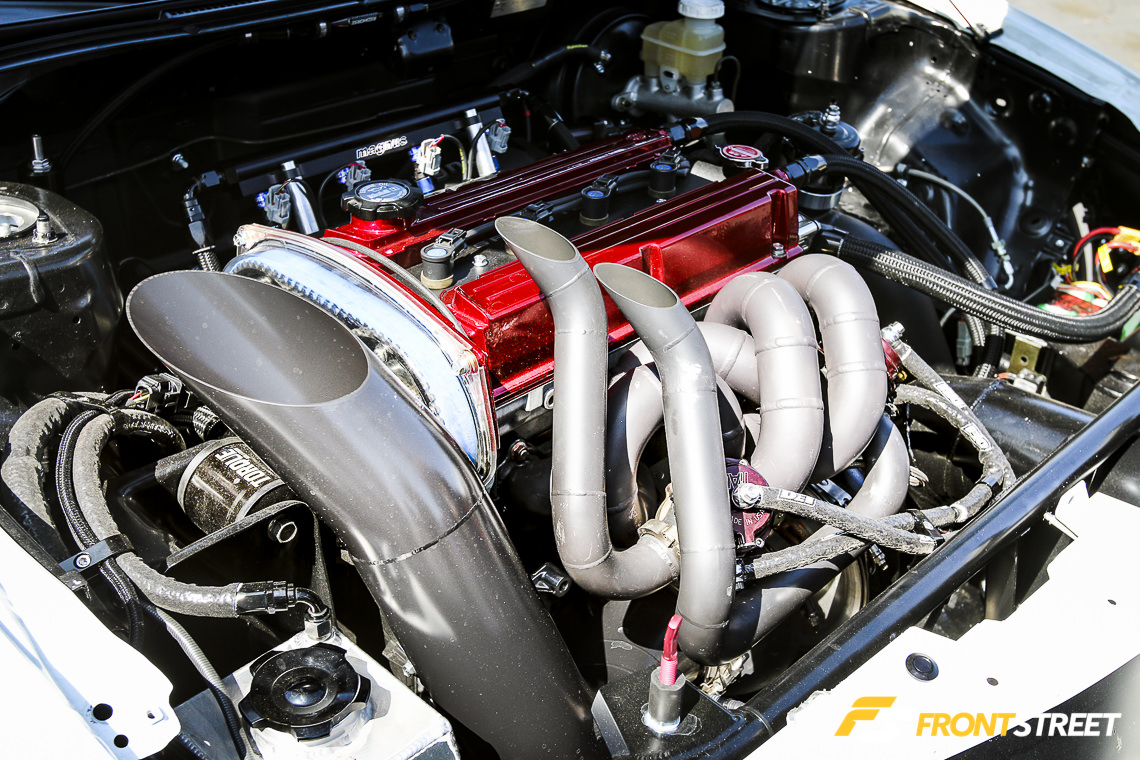 With an impressive 1,156 horsepower on tap, the rebirth of the English Racing ER/ETS Drag 8 was in full stride and showcased at MOD. Engine specs include a solid fill ER 2.0-liter engine with Wiseco 11.0:1-compression pistons, GRP aluminum rods, GSC S3 camshafts, Kiggly valve springs, and an ER race ported cylinder head. A custom designed ETS turbo kit with T4 twin scroll 1.28 housing and PTE 7285 Gen 2 turbo is mated to a ETS 6-inch intercooler, which subsequently force-feeds a Magnus V5 intake manifold. To quench the thirst of this methanol-fed beast, the Evo is engineered with a set of eight Fuel Injector Clinic 2,150cc injectors. Additional specs include a tube-frame front end, Graf Autohaus 5-speed dogbox, Competition Clutch triple disc clutch kit, and a Ron Piercy-fabricated 10-point chromoly rollcage. The team expects to debut this newly-updated vehicle in the near future.