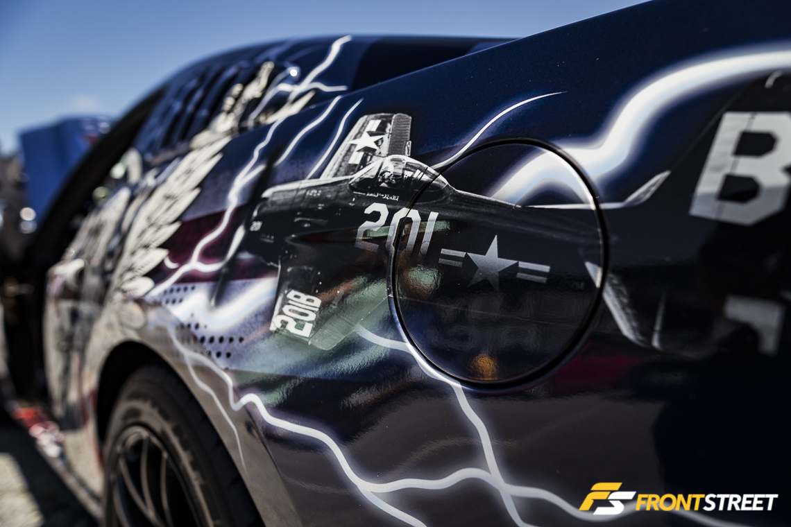 Scott Perry’s 2011 California Special Mustang is an award-winning machine we’ve seen before. The daily driver knocks down 674 horsepower when running on pump fuel and 1,021 ponies when E85 is added. The car sports a Rich Groh Racing shortblock with billet connecting rods and forged pistons, a full complement of JPC Racing speed parts including custom intercooler and wastegate, and a Vortech XB-110 supercharger. The car was conceived as a thank-you to our Armed Forces and wrapped accordingly. The detail in the wrap is amazing.