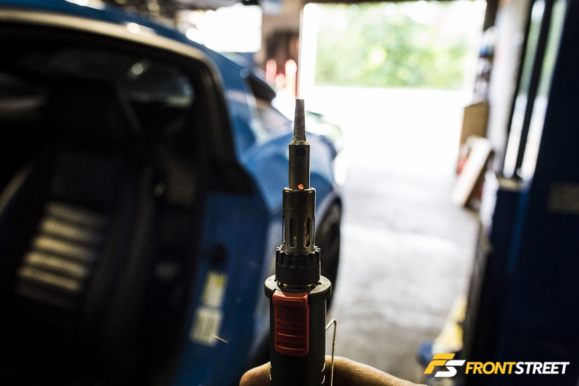 Palazzolo went the extra mile to ensure these wiring connectors were connected securely. In certain locations, butt connectors and heat shrink were used; in others, the soldering iron was put to work. He tapped into the headlight switch for the illumination circuit.
