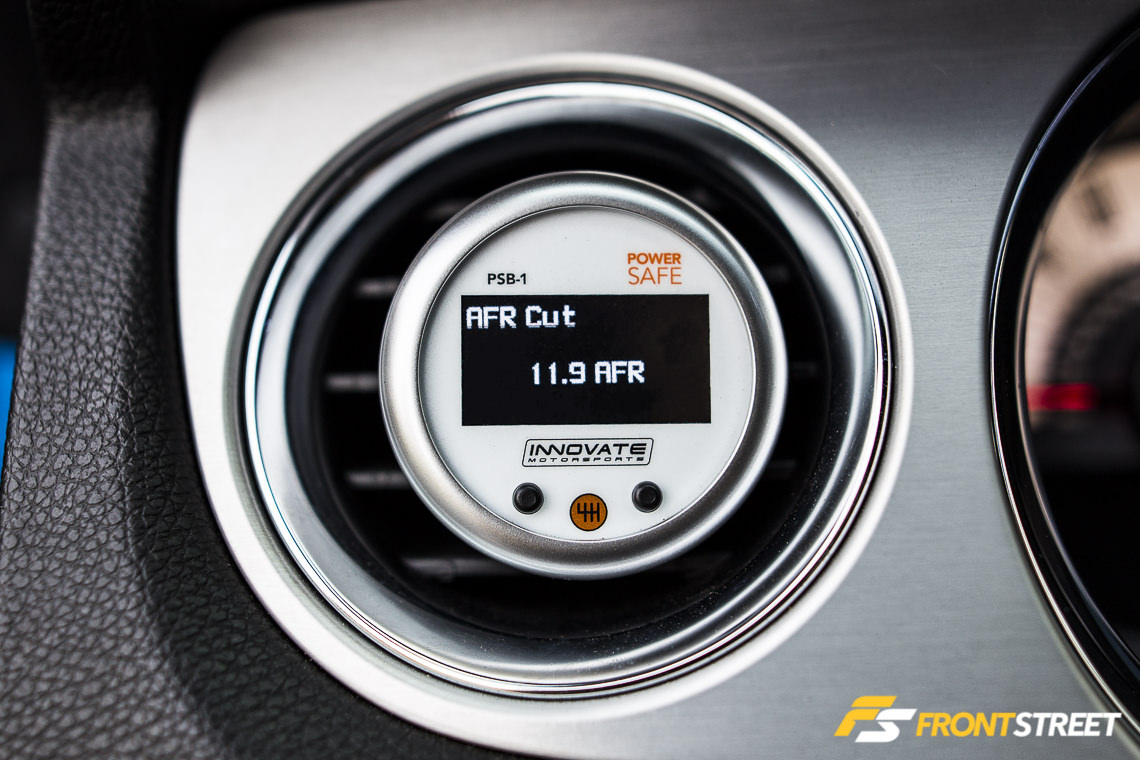 To test the system’s operation, the AFR Cut was set at 11.9:1, and the boost pressure was set at 1 psi. A quick drive to let the supercharger build boost, the solenoid’s operation was clearly heard, and the boost pressure fell off as intended. When the PowerSafe system is operating and the defined conditions are met, the words “Boost Cut” will appear in the top right corner of the gauge. As you might imagine, with a 600-plus horsepower car, it wasn’t possible to photograph this particular portion of the install. Once we verified the operation of the gauge, the conditions were set to 12.5:1 air/fuel ratio and 3 psi, which will keep us well in the safe zone should there be an issue. The Innovate Motorsports PSB-1 PowerSafe gauge looks right at home in its position, and works flawlessly. Once we get a few spare minutes, we’ll hook up the shift light, then get back to the track with the car.