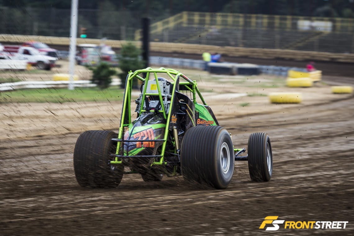 The mud rain continued with the NEWS Sprint class – with the little tires up front and monster meats in the rear, these little cars squirt around the track.