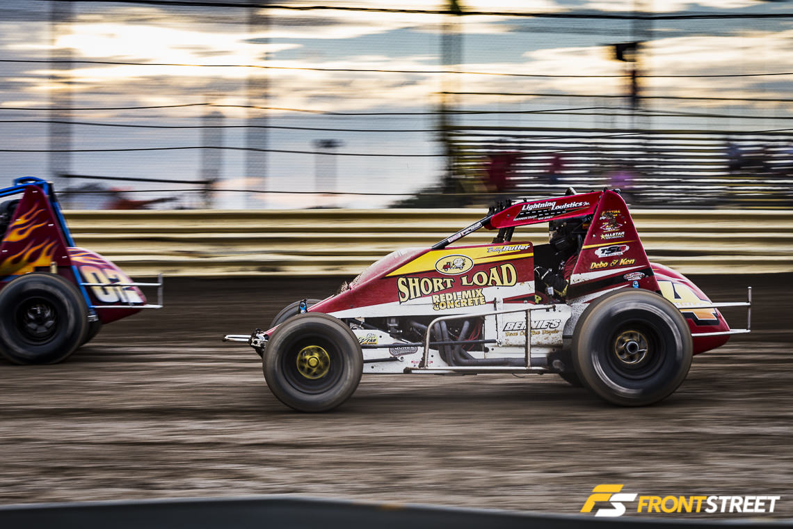 Just inches separates the racers from one another most of the time – the racer who finds the clean line through the turns and is smooth with their driving motion can often find an advantage. Rich Mellor (far racer) is in the fourth points position in his NEWS Wingless Sprint car.