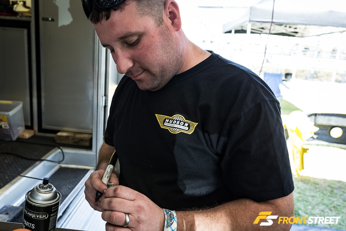 “It’s getting hot in here, so take off….”.. kidding, I’m KIDDING. Vinny Palazzolo was behind the wheel of Benny Ortiz’s immaculate GT500 Mustang this weekend, doing tuning duties and continuing to help Benny sort out the car and eventually make his own way into the seat. They thought the car had torched a headgasket, so the heads came off and a new set of gaskets were installed into the engine. Despite the effort, Palazzolo went down to newcomer Leroy Nabors Jr. in the second round of competition.