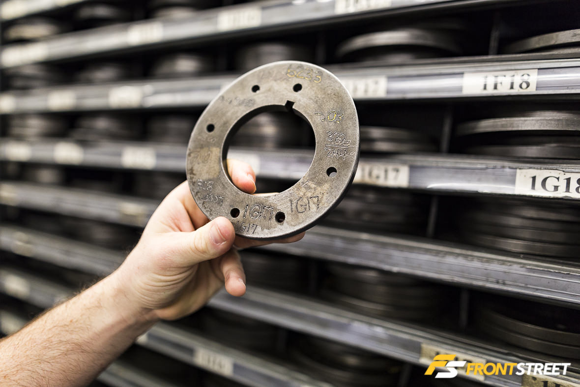 Here’s where the secrets begin. Any idea what this is? It’s actually a camshaft master lobe, and without these, it’s not possible to manually grind camshafts. These eccentric profiles are engineered and developed by COMP’s R&D team, then manufactured in-house and put to work on the company’s manual grinding machines. There were seemingly thousands of these in the storage room, kept under lock and key.