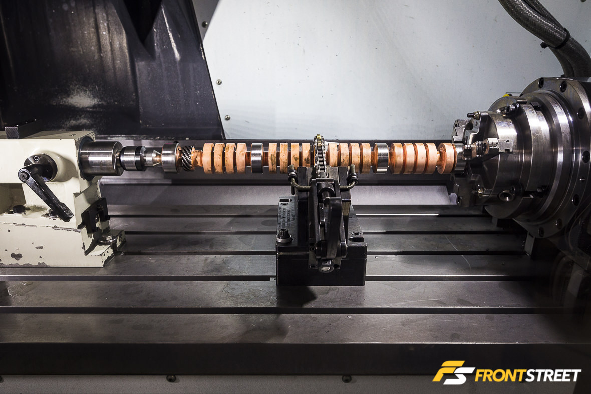 Not every camshaft is ground on the manual machinery. Many – especially the tool steel units – are manufactured with CNC machinery such as this Okuma GC34-Nh, which uses specialized software offering over 2,000 data points carried out to seven decimal places to allow the machine operator to properly grind the camshaft.