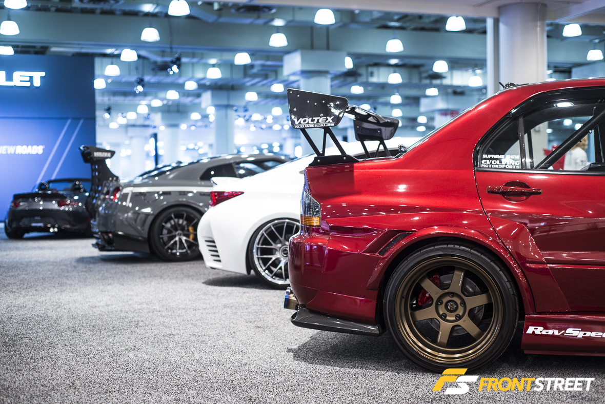 Finishing off my day was a trip to the lower floor of the event, where industry-leading wheel manufacturer RAYS Wheels utilized valuable floor space to showcase their new wheel models, both individually and also featured on a select group of worthy vehicles. This year, that assortment included an RE-Amemiya Mazda RX7 with Gram Lights 57Transcend wheels, an ND5RC MX-5 Miata with Volk Racing TE37V wheels, a Subaru STi with Gram Lights 57CR wheels, and a Mitsubishi Lancer Evolution, also with Volk Racing TE37V wheels.