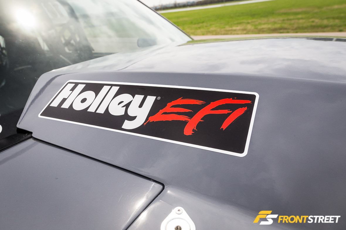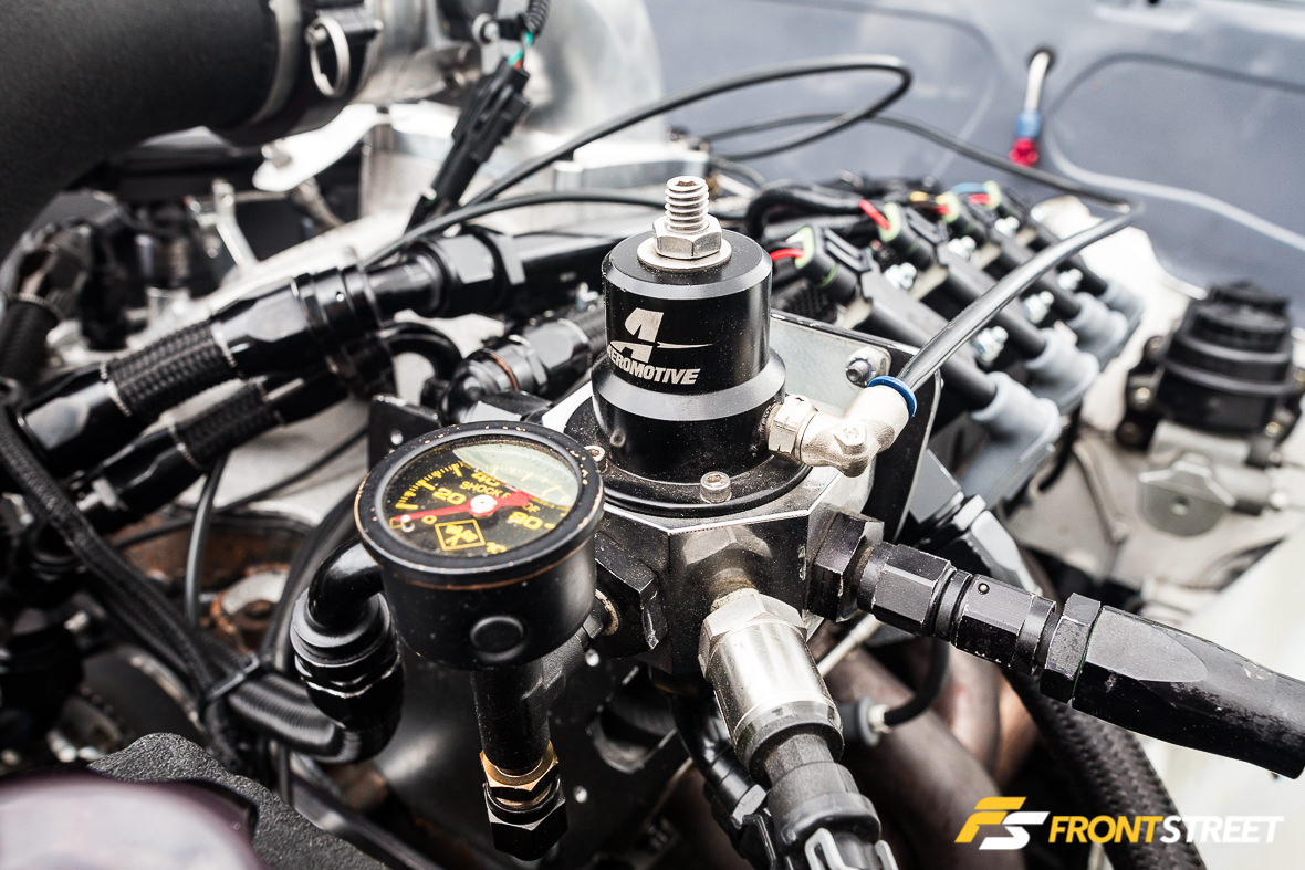 The Ultra Street class rules limit the engine components used; Eichhorn selected a set of Trick Flow High Port cylinder heads and a custom intake manifold from Wilson Manifolds to top off the short-block and manage airflow expectations. These are fed by one of Precision Turbo’s 76 mm cast-wheel turbochargers, fed by a TIG Vision-crafted turbo system.