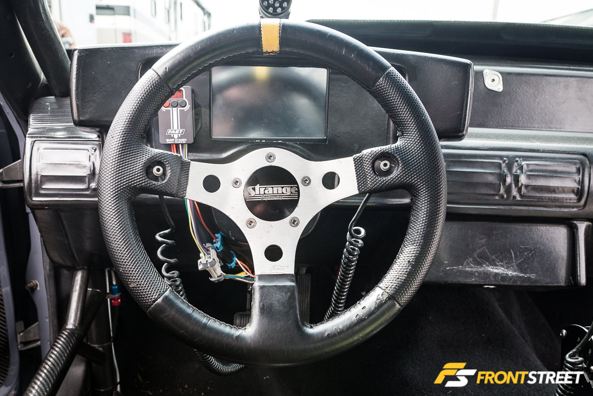 The chassis has been set up with a stock-style front suspension system featuring components from Racecraft, Inc.; the company’s tubular control arms and k-member combine with lightweight drop spindles and steering system to sharpen steering performance while reducing weight to the absolute minimum. Menscer Motorsports-modified Afco Racing double-adjustable front struts and Afco springs are up front, with Menscer/Afco double-adjustable rear shocks also in play. The dampers have been valved to help Alm get down the track on the small 275/60/15 Mickey Thompson ET Street R tires he runs in the Ultra Street class. Strange four-piston brakes are hidden behind Weld Racing V Series 15×3-inch front and 15×12-inch rear wheels at the corners.
