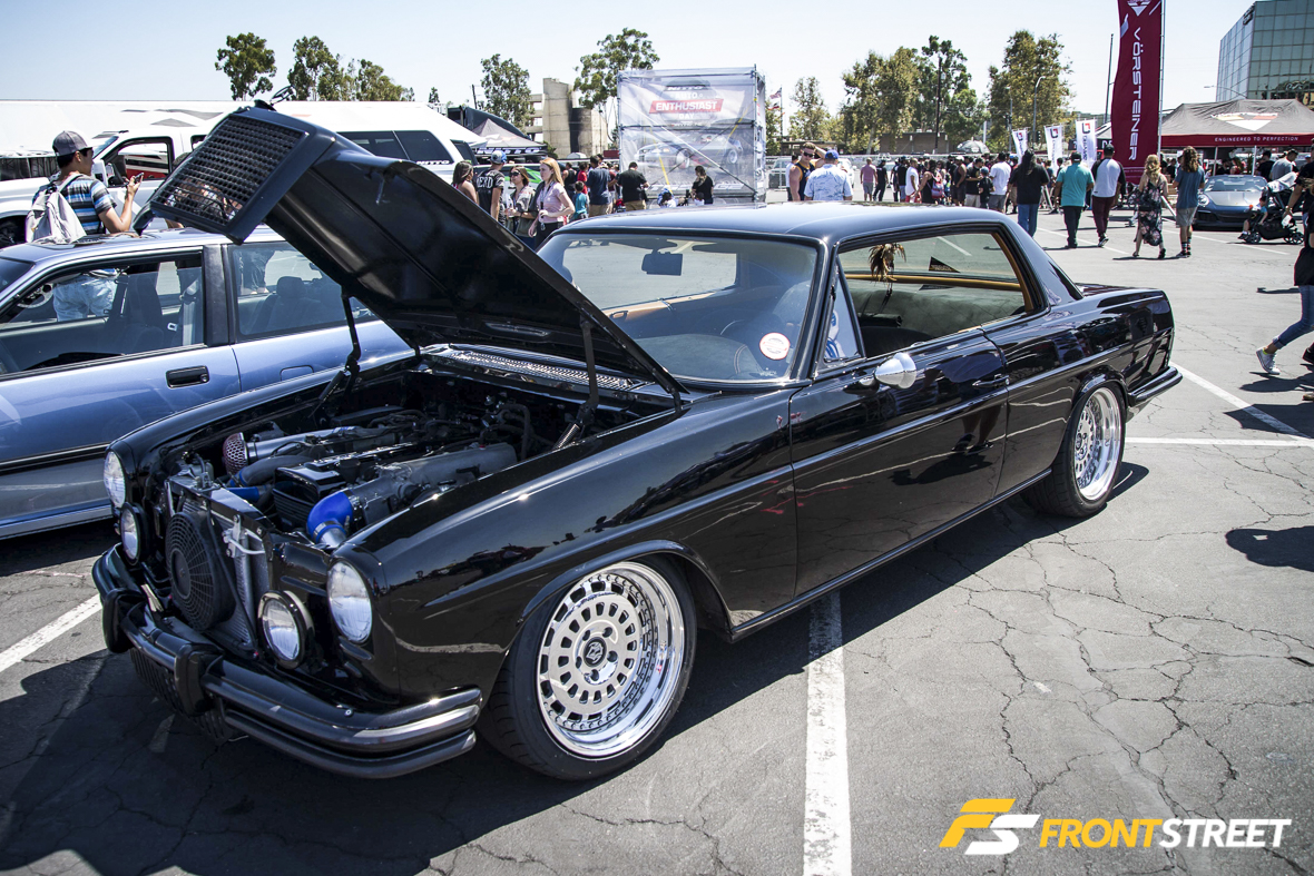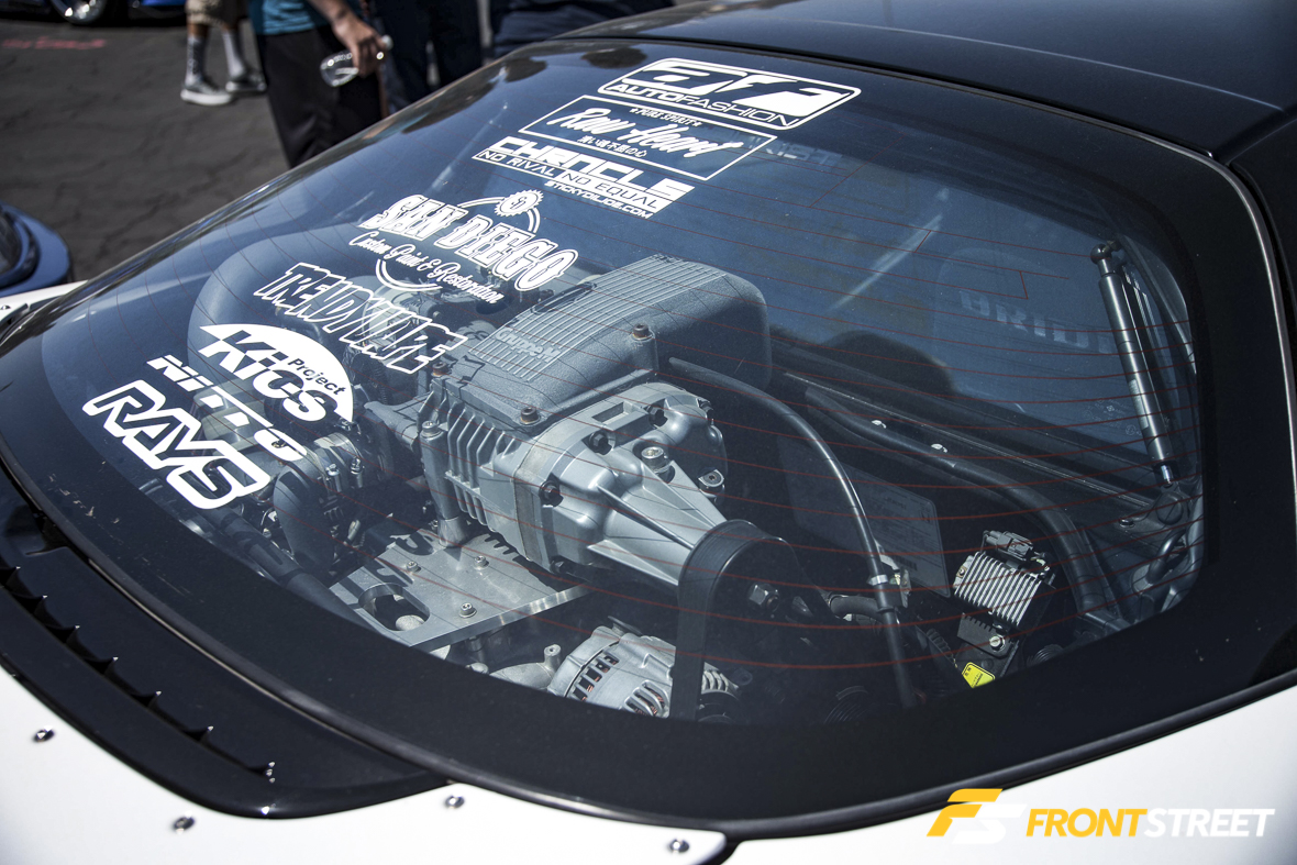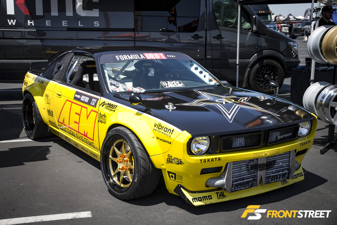 The Feal Suspension booth housed one of our personal favorite cars of the day. It was a sleek black painted S13-chassis 240SX coupe with a front-end taken from an S14-chassis. This car was a showstopper, built with everything from looks to horsepower to craftsmanship. The roll cage, which even cradled the 2JZ-engine in the bay, was painted a contrasting white hue with dimple-die gusset plates throughout the interior and engine cage. The waste gate dump tubes pointed out of the hood with holes at the end to mimic muzzle brakes commonly found on rifles. Wisefab knuckles were chosen to add more steering angle to the car.