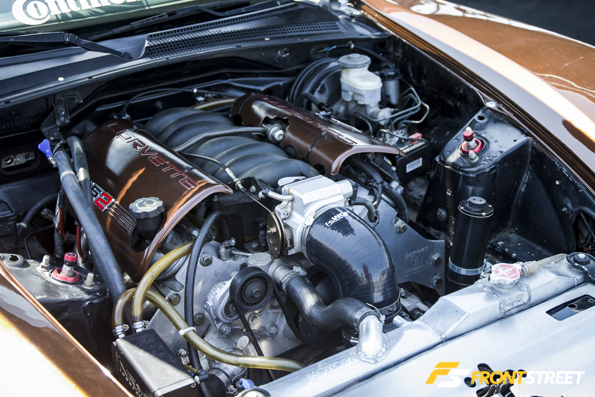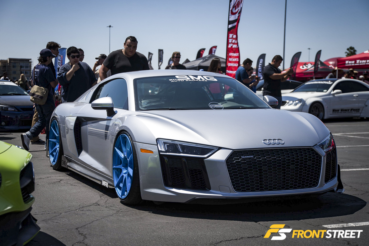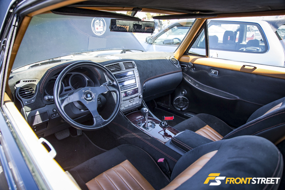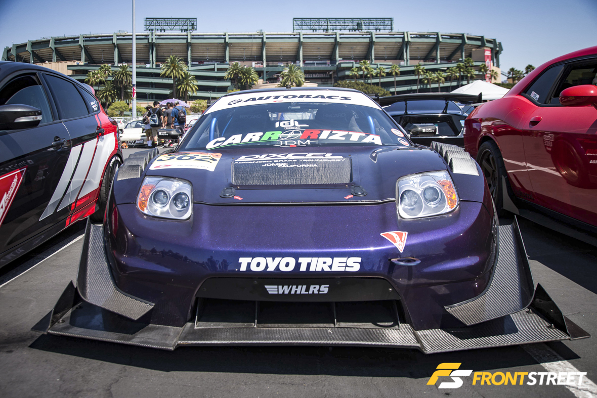 The Feal Suspension booth housed one of our personal favorite cars of the day. It was a sleek black painted S13-chassis 240SX coupe with a front-end taken from an S14-chassis. This car was a showstopper, built with everything from looks to horsepower to craftsmanship. The roll cage, which even cradled the 2JZ-engine in the bay, was painted a contrasting white hue with dimple-die gusset plates throughout the interior and engine cage. The waste gate dump tubes pointed out of the hood with holes at the end to mimic muzzle brakes commonly found on rifles. Wisefab knuckles were chosen to add more steering angle to the car.
