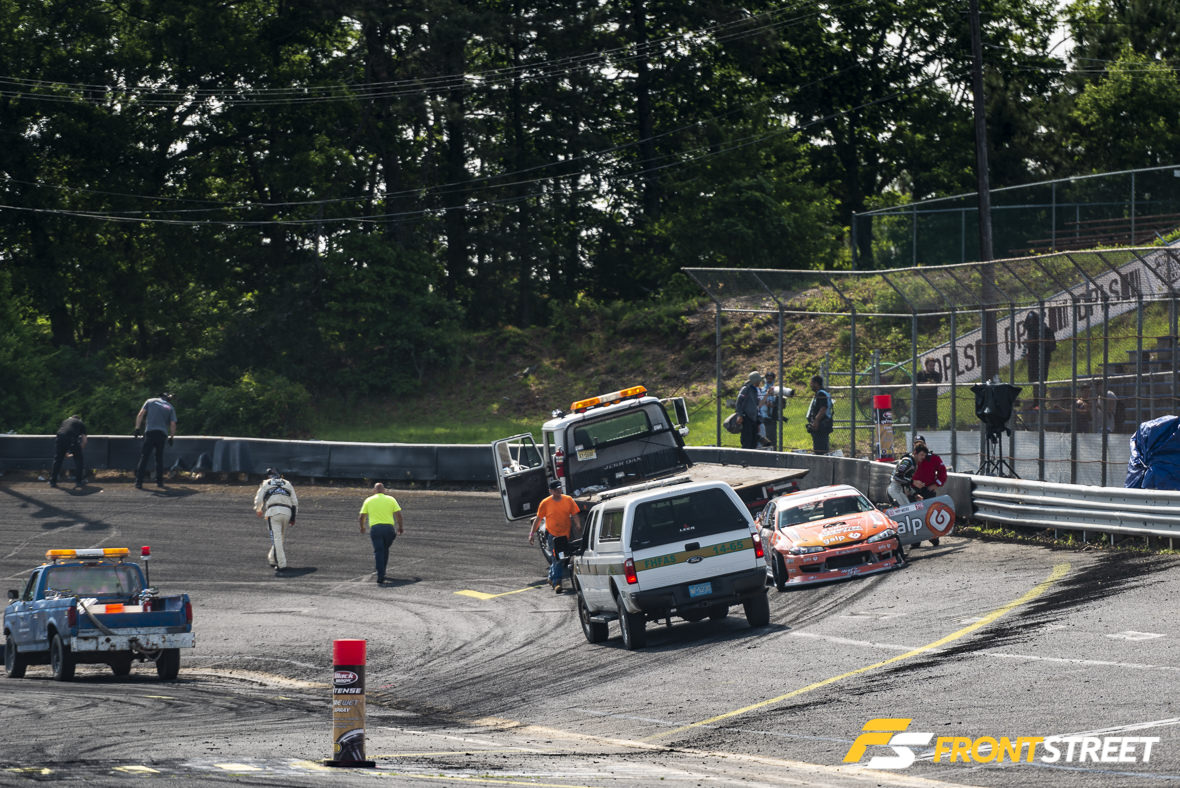 Practice got underway with drivers still weary about the potential weather, pushing their cars to the limits of the track. New for this year, the Formula Drift staff had affixed black plastic paneling to the sharp guardrail in an effort to promote a sliding effect on the wall, rather than the infamous grasping of competitors’ cars this track is known for. The issue came when the cars abused the paneling. The plastic took quite a long time to replace, which slowed down the practice sessions early in the day. Because of this it was removed prior to Saturday’s festivities.