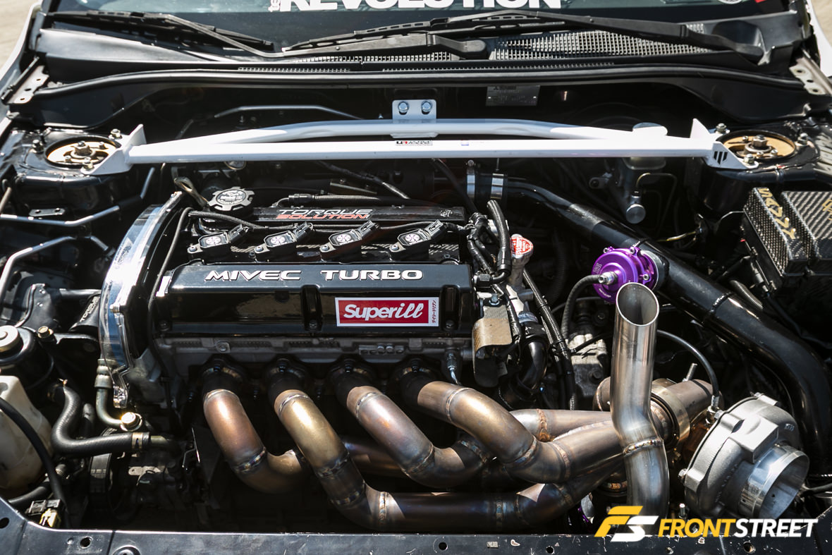 Imagine this EVO pulling alongside you at a stoplight, as you peer over and notice a set of triple stack exhaust and wastegate dump tubes exiting out the hood, along with the Weld wheels wrapped in Mickey Thompson ET Street S/S radials.