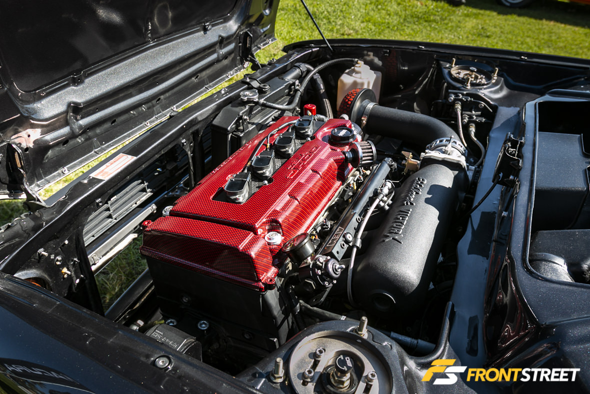 The stance was achieved using custom control arms, BC Racing coilovers and a set of 15×6-inch Work Meister wheels.
