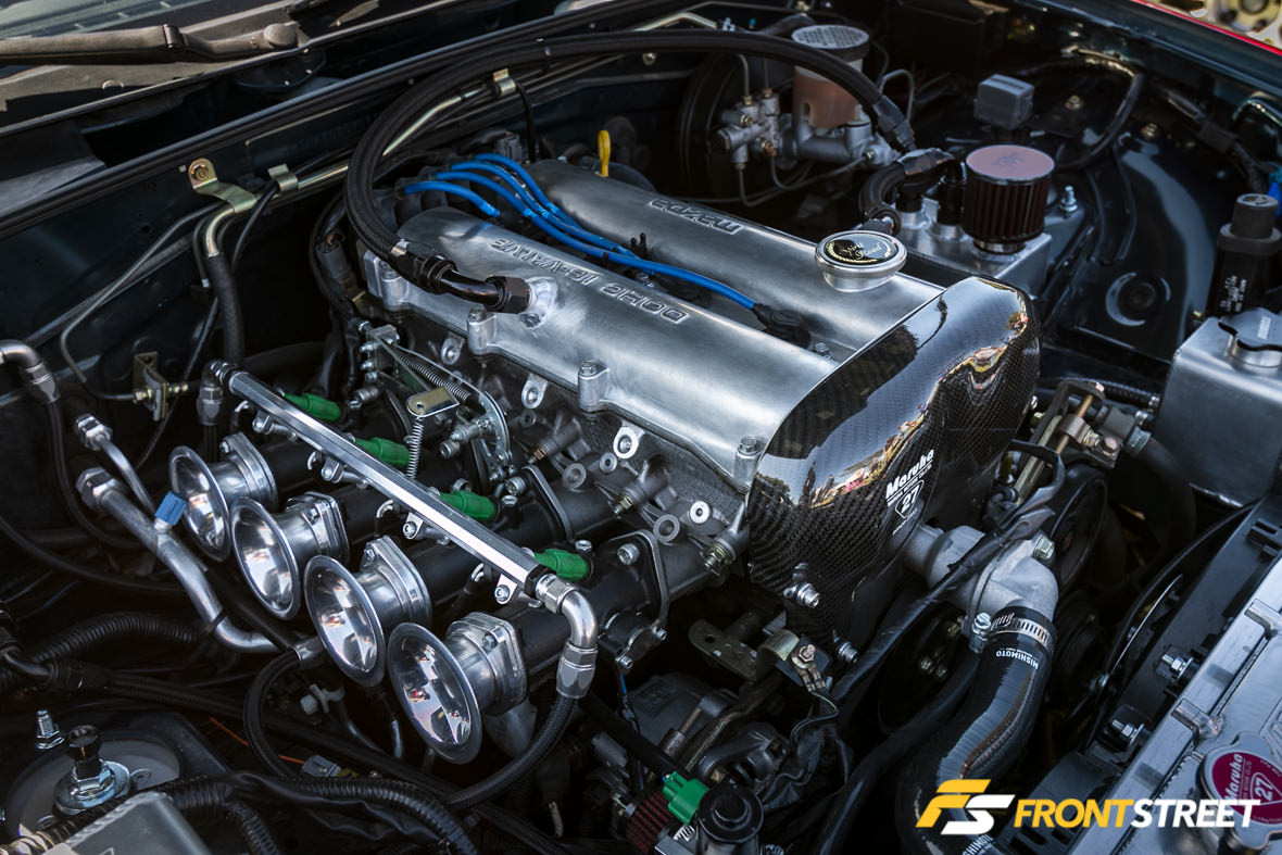 It sports a Rocket Bunny Pandem wide-body aero kit, triple Solex carburetors, and custom Panasport wheels wrapped in 315/35-17 tires Nitto NT01 rubber on the rear.