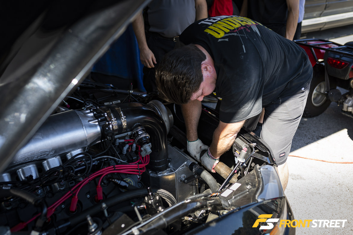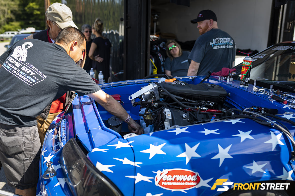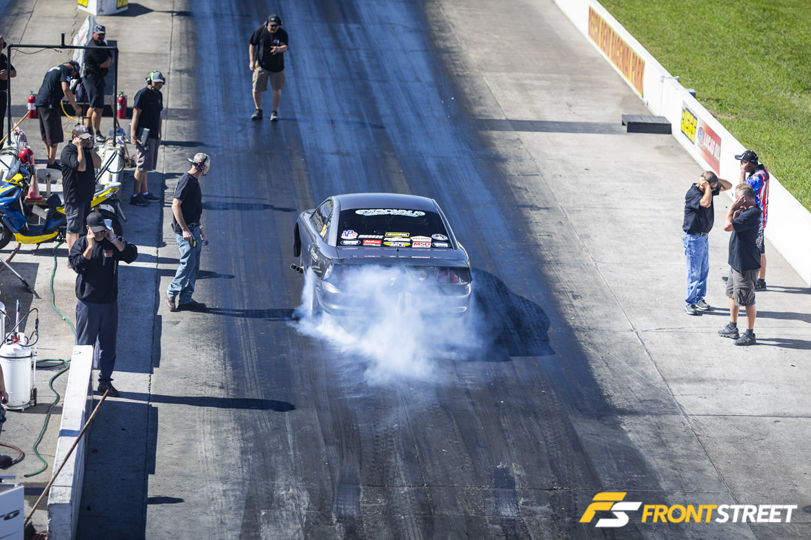 Remember our buddy Nick Bacalis, engine builder at Bischoff Engine Service, and subject of one of Front Street’s most popular articles? Well, the engine in this machine has since been updated with electronic fuel injection and a big whiff of nitrous, and Bacalis has been whacking the throttle whenever possible. He recently won the NMCA’s World Finals event in Street Outlaw, and crossed over here to NMRA to run in the Street Outlaw class here. With Holley’s Dominator engine management system on top of the engine and Induction Solutions nitrous feeding plenty of squeeze, Bacalis has been running solidly in the 4.30s since getting a handle on the car. Interestingly enough, he handles all aspects of engine tuning, and prior to this engine had never run nitrous before. He told me that the car makes so much torque it comes up on the tire and will basically ride the wheelie bars and not come down until after he lifts off the throttle at the eighth-mile. I looked at the data from his logger and will say that he’s not lying.. the graph was pretty wild. He also says there are 4.20s lurking in this car, possibly by the end of this season.