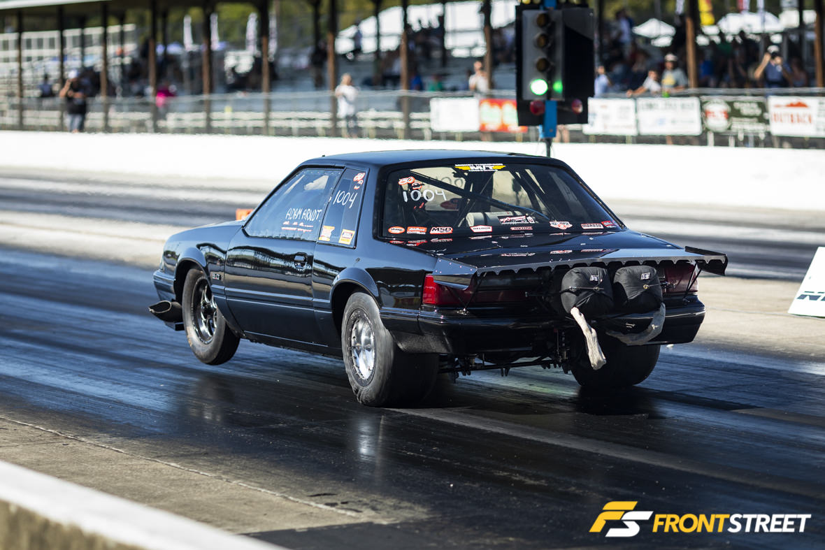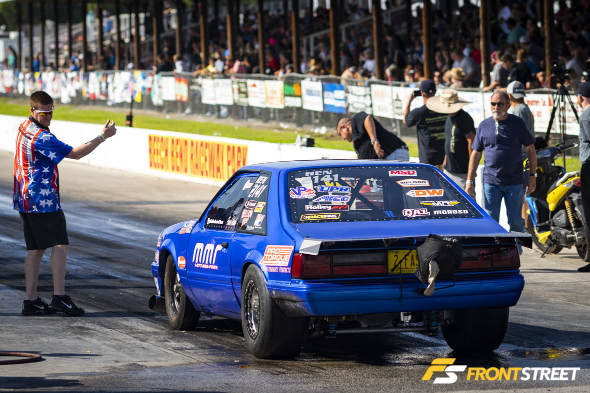 Alton Clements (foreground in above photo) had quite the weekend. After picking up this new-to-him car from Manny Buginga, he qualified second behind class champion Andy Manson in Street Outlaw. During qualifying, air got behind the Lexan window on the driver’s side of the car, pulling the window out and breaking the frame right off the door. One $140 trip to the swap meet later, Clements’ team was modifying the steel stock door and remounting the hinges to it so he could continue to race. Then on Sunday, he knocked out Travis Franklin and Nick Bacalis on his way to the final round against Manson. When the tree dropped, a holeshot launch secured Clements’ win at nearly 168 mph by a mere 3.72 feet. Oh, and the swap meet guy made him buy the pair of doors, so I think there’s a passenger side Fox body door for sale in South Carolina.