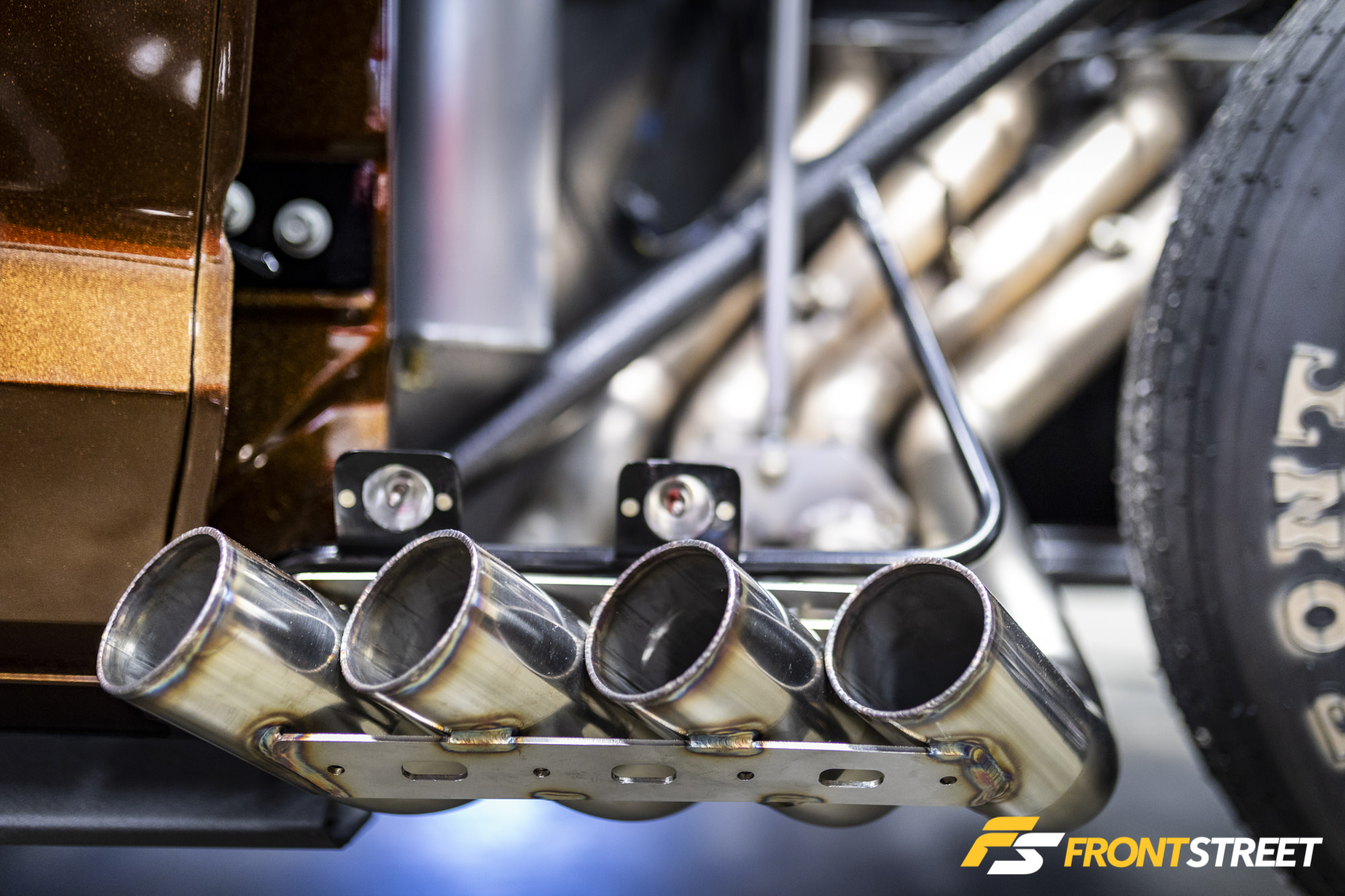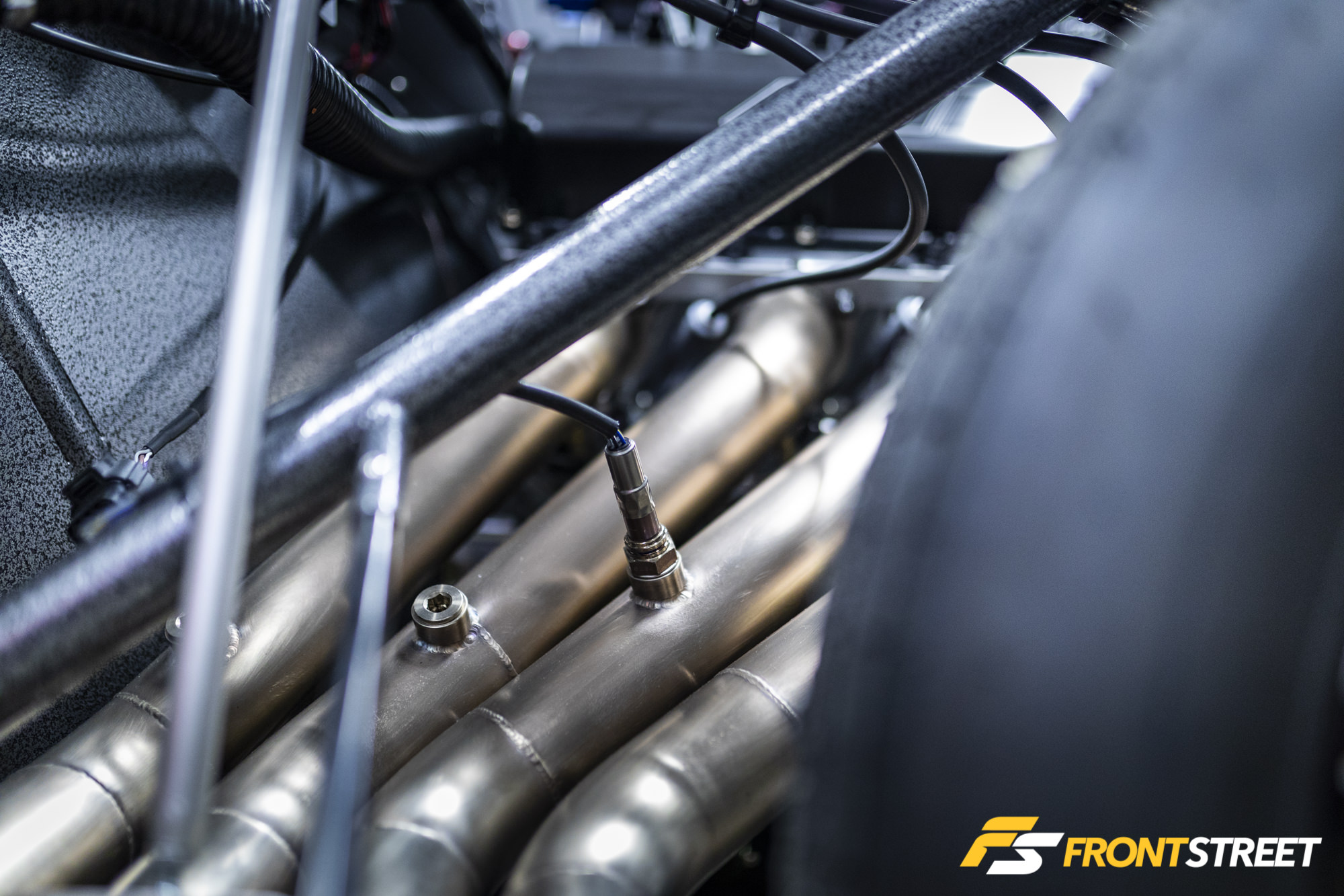 The four-link suspension took him some time to iron out, with several non-fruitful passes before he finally discovered the sweet spot. Now that he has, though, he feels like he’s not at its limit yet—it just keeps taking everything he throws at it, and the car hasn’t even tried to make use of the wheelie bars down the track yet. It’s possible that there are still six or seven hundredths of a second locked up in the car’s performance as he begins to ramp the power in earlier in the run.