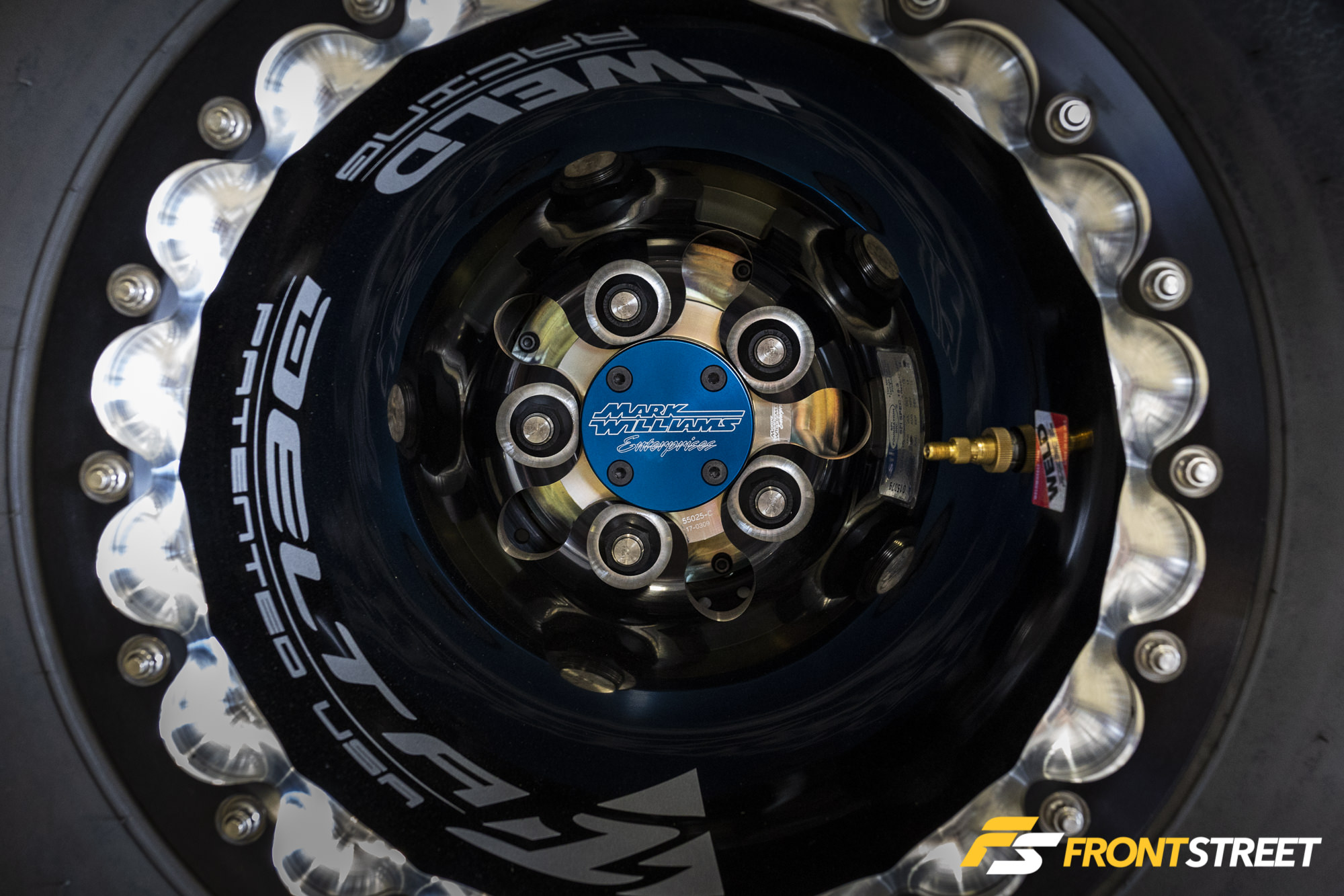 Up front, the strut-style suspension uses spindle-mount JRi Ultra Struts coupled with Hyperco springs and Strange Engineering brakes. RC Components wheels up front and Weld Racing wheels out back wear Mickey Thompson tires; Essick is one of the last holdouts in the class using the true 33 x 10.5 x 16-inch slick tire and says he doesn’t have any plans to change that, as it’s far more forgiving on marginal track surfaces.