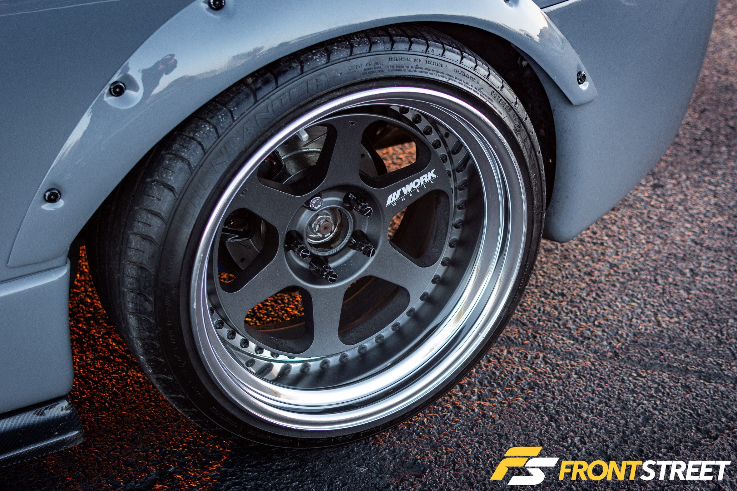The Nardo Grey-laden exterior utilizes nearly the entire Carbonetics catalog, including its AB hood, CSL hatch, lip kit, splitter, headlight vent, wiper cowl, front bumper, and fender flares. The chassis uses Fortune Auto 500 series coilovers with Swift springs to keep the car planted and rest the widened fenders over a brilliant set of Work Meister L1 wheels measuring 19×11-inch at every corner.
