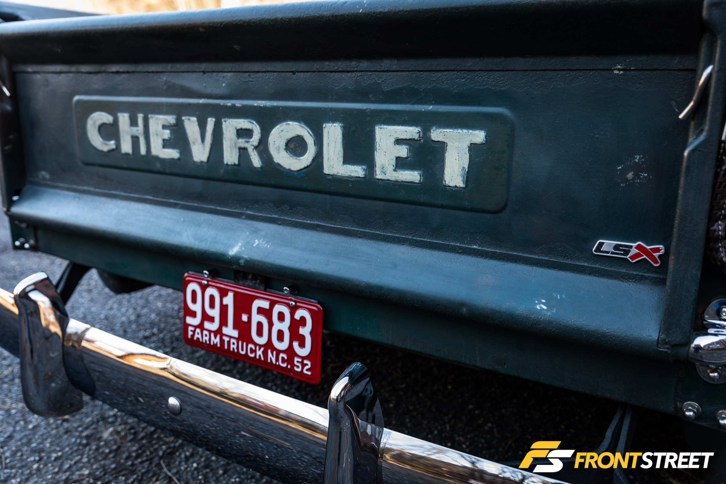 I first saw Chris’ truck while some friends and I were walking around a car show held at Kooks Custom Headers here in North Carolina. My buddy smiled and said, “I think you’ll like this one.” I walked over to introduce myself—gazing over the menacing laid out stance—and as the hood was open, a small-block Chevy came to mind. But no, as I’ve stated before, Chris wanted a driver, and nothing appears to be suited better in the modern aftermarket automotive industry than an LS swap. The 3100 does not use just any LS though: a GM LS2 crate motor with an LSA blower is sitting on top. He didn’t stop there, though, because who wants a cruiser without a little pep in its step?