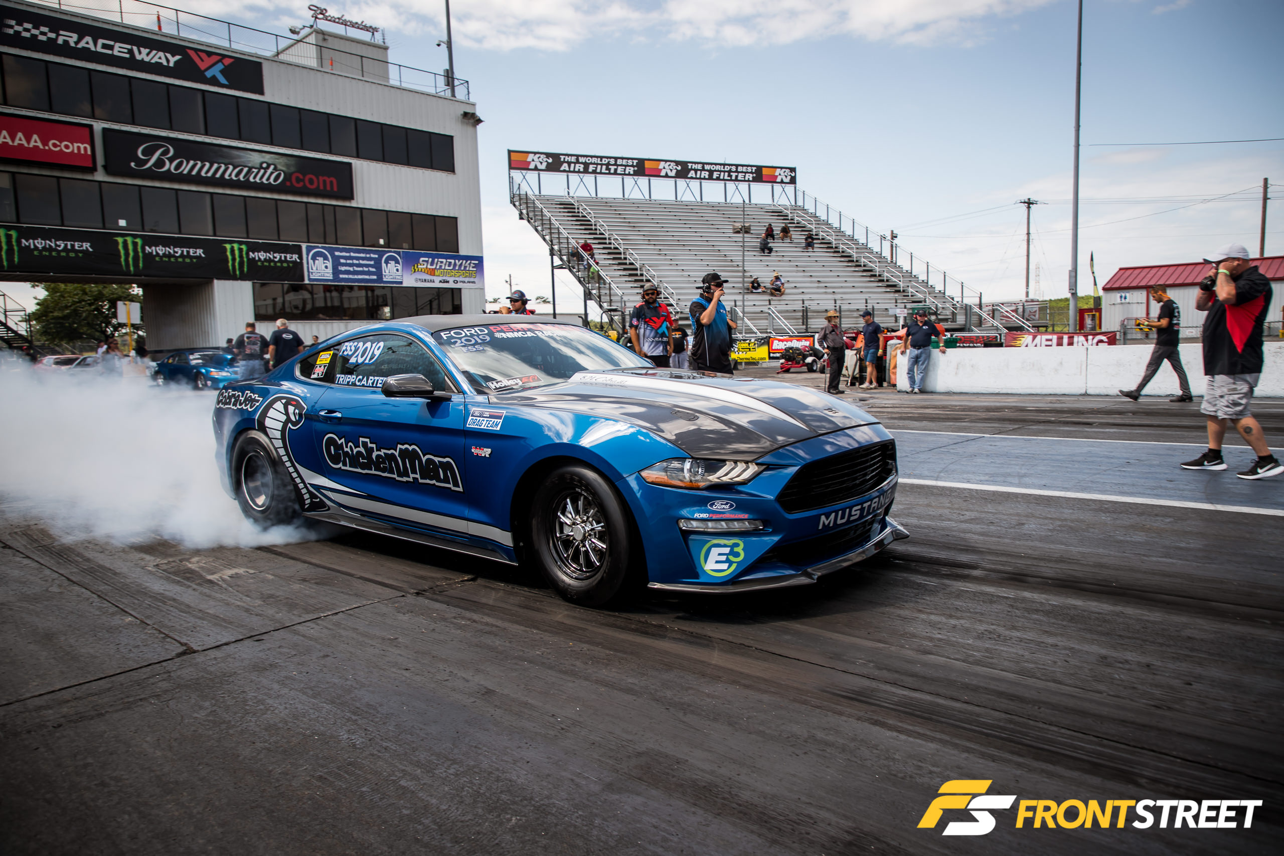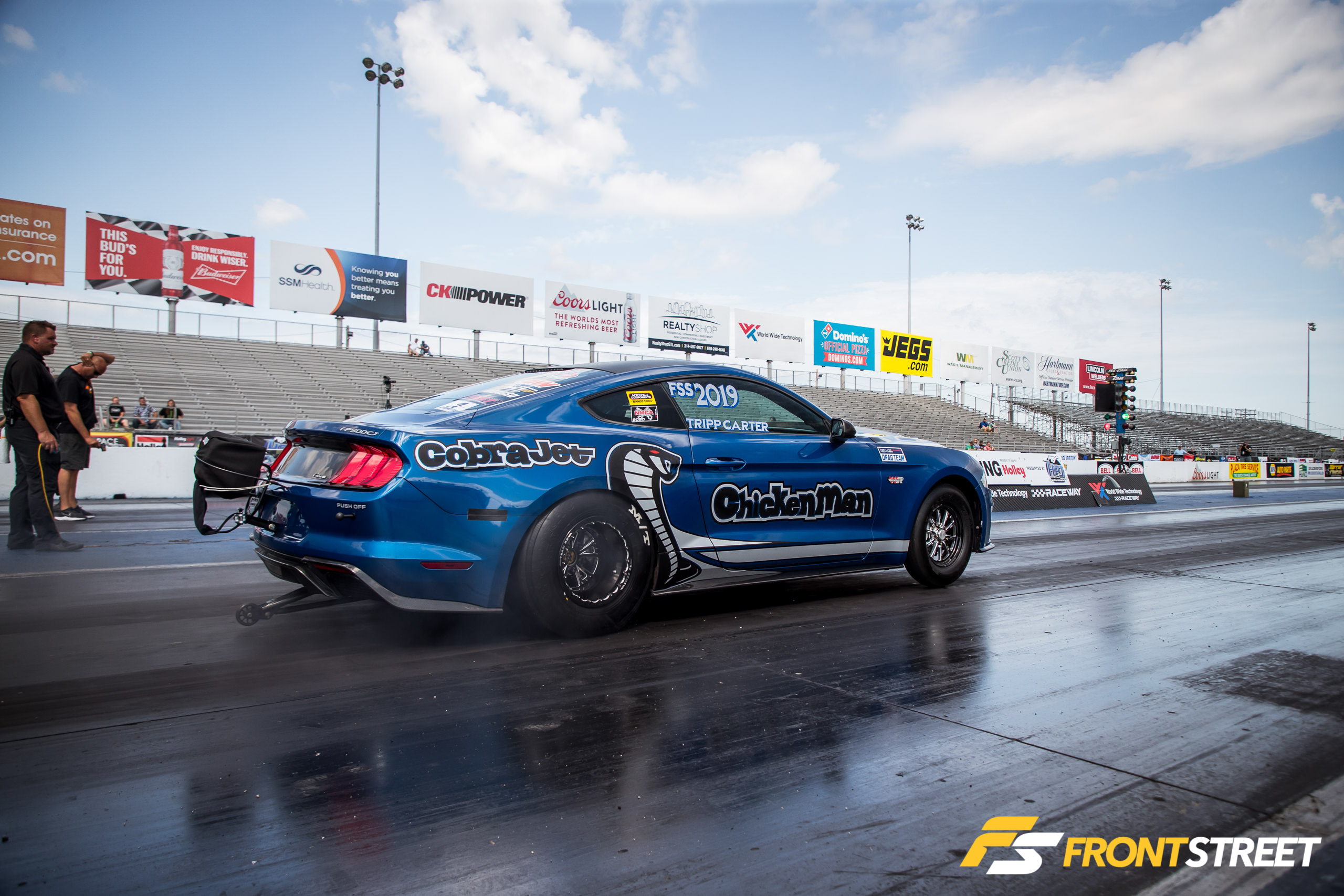 Nowhere was this made more evident than in Factory Super Car, where it seemed like everyone was either haulin’ ass or lazy off the line. Half the field was digesting the cooler evening air into deep 7-second passes, while everyone else was over half a second off the pace. Tripp “Chicken Man” Carter was coming off a massive win in Atlanta against his teammate, Chuck Watson, where the two men kindly provided airborne champagne samples for bystanders of the Aerospace Components Winner’s Circle. Carter qualified with the lowest elapsed time in the class with a 7.64 run, with his teammate just one-hundredth behind him. The Cobra Jets are flying right now, but Scott Libersher sat his COPO Camaro five-hundredths behind the quickest CJs — something he could easily compensate for with quick reaction times. Libersher matched up against Carl Tasca in round two and got off the line first with a .034-second reaction time, but that wasn’t enough, as the 3.0-liter Whipple supercharger in Tasca’s Coyote huffed to the finish line first and booted the final Chevy from contention. Tasca then fell to Carter in the semis, while Bill Skillman took out Watson to spoil a final-round rematch. The Chicken Man took the back-to-back victory in an all-CJ final round and slid himself comfortably into first place in points by jumping ahead of Chris Holbrook.