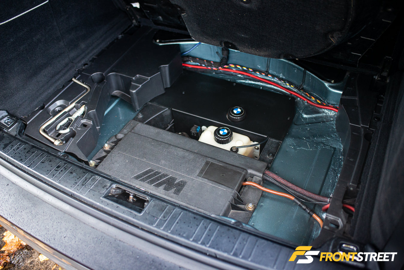 This brings us to the rear subfloor, which Gabriel recalls as the most challenging aspect of the build. To truly mimic the M5 Touring’s specs, he felt the floor and trunk layout needed to be identical. This includes shedding the wagon of its stock spare tire carrier — an option not found in an M5 — and equipping the rear with the M5’s center-mounted battery and a compartment housing its OE tire inflation kit. This could have been achieved rather quickly with a torch. Instead, Gabriel arduously and skillfully drilled out every necessary spot weld on both vehicles’ floor pans and welded the M5 floor pan into place on the wagon in a true OEM fashion. By making this change, he was also able to run the M5-appropriate dual exhaust.