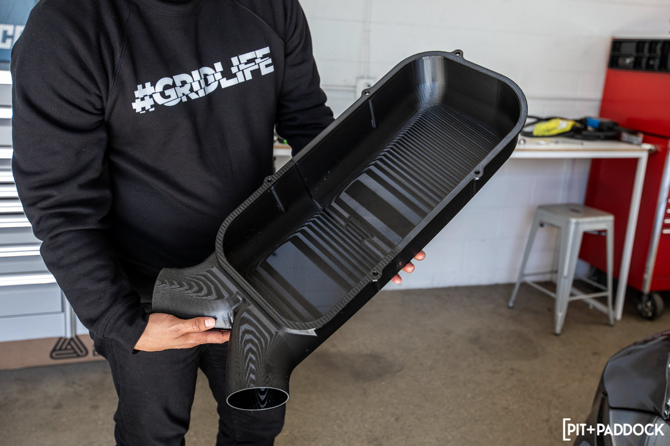 There were design challenges from the get-go. The Judd engine comes with an airbox base that integrates into the ITB runners. Since this engine was originally designed and used in Formula cars and Le Mans prototypes, this engine is typically mounted behind the driver. The airbox base attaches to a big forward-facing air scoop allowing its design to go vertical with no other obstacles to design around. There’s not exactly an off-the-shelf airbox design to use with the Judd when being mounted in a street car, so we had to design around the factory hood line, front-mount radiators, fender wells, oil coolers, radiator core support, and body panels while still placing the air filters in the path of clean, fresh air. We need to make sure the roof of the box sits high enough over the velocity stacks to avoid creating air turbulence but still be low enough to fit under the hood. The box has to have enough volume to not cause an airflow restriction for the engine, which revs up to 11,000rpm.