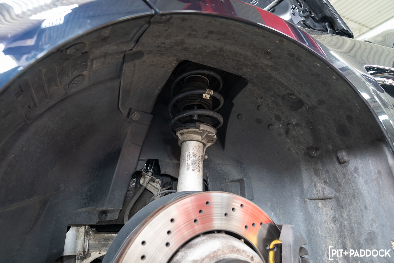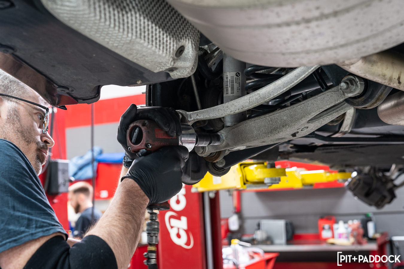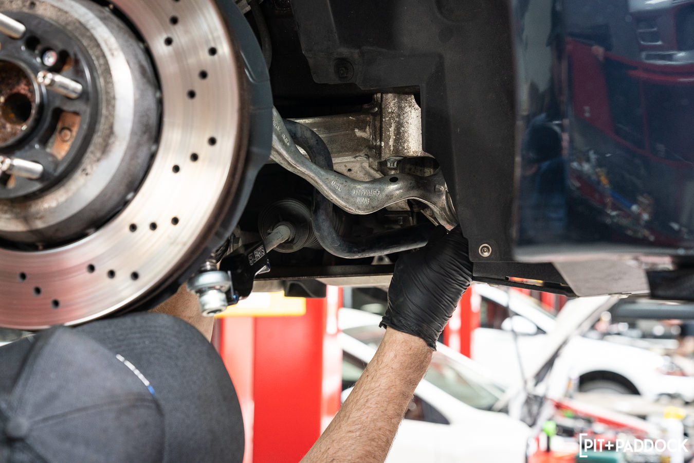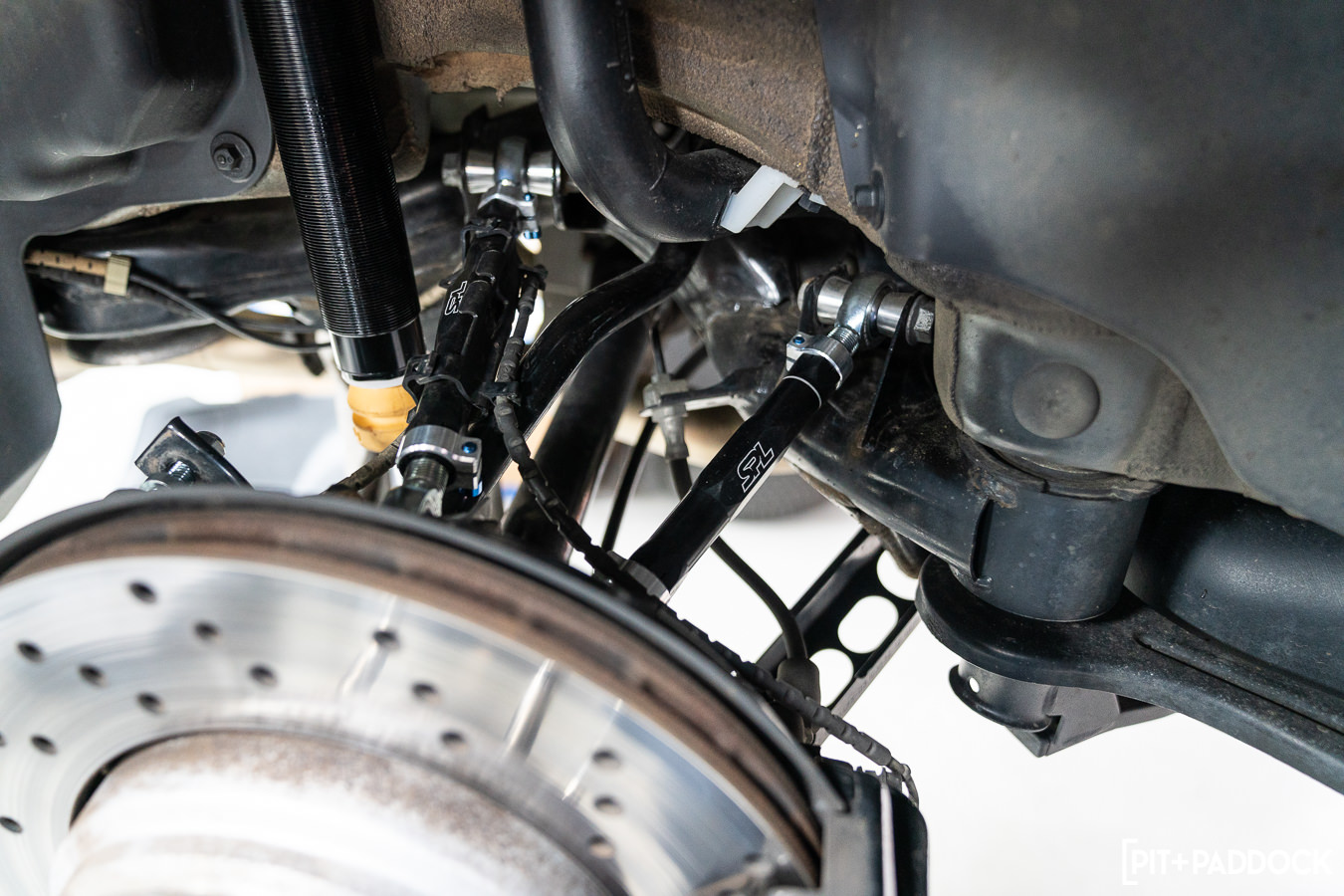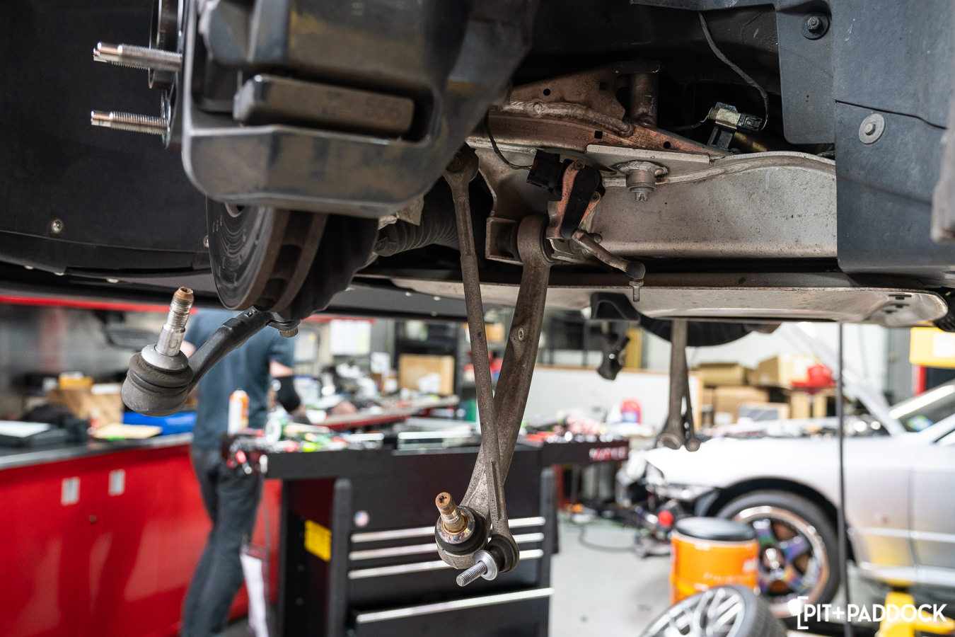 With the factory suspension dismantled at various points on the car, Pat at R/T Tuning installed the adjustable arms from SPL Parts in their corresponding factory locations. Not before spinning each component and rod out to match the factory arm lengths in preparation for making finer adjustments later on R/T Tuning’s in-ground Hunter laser alignment rack.