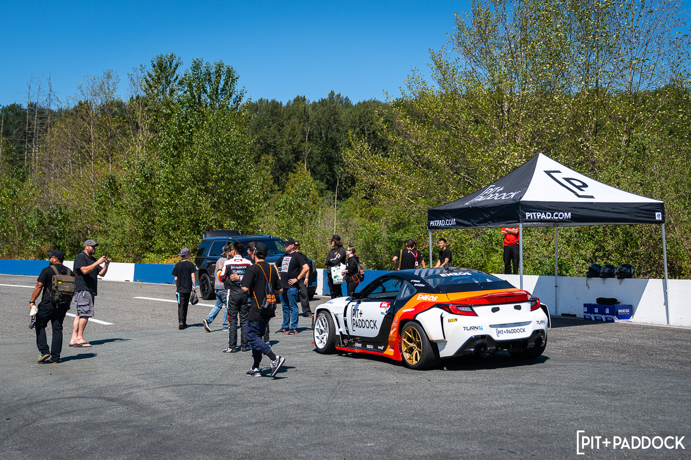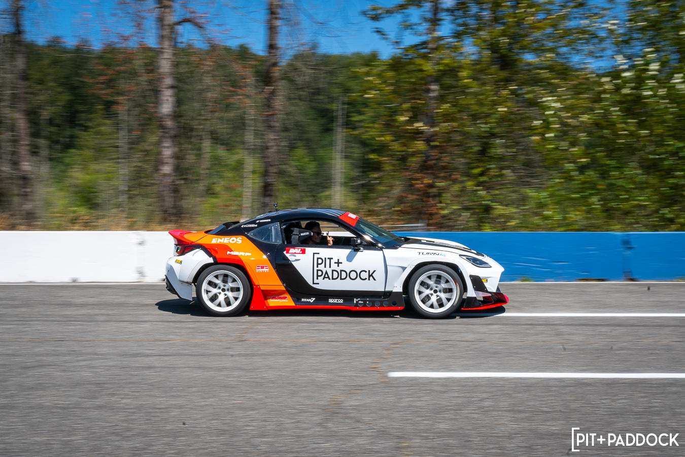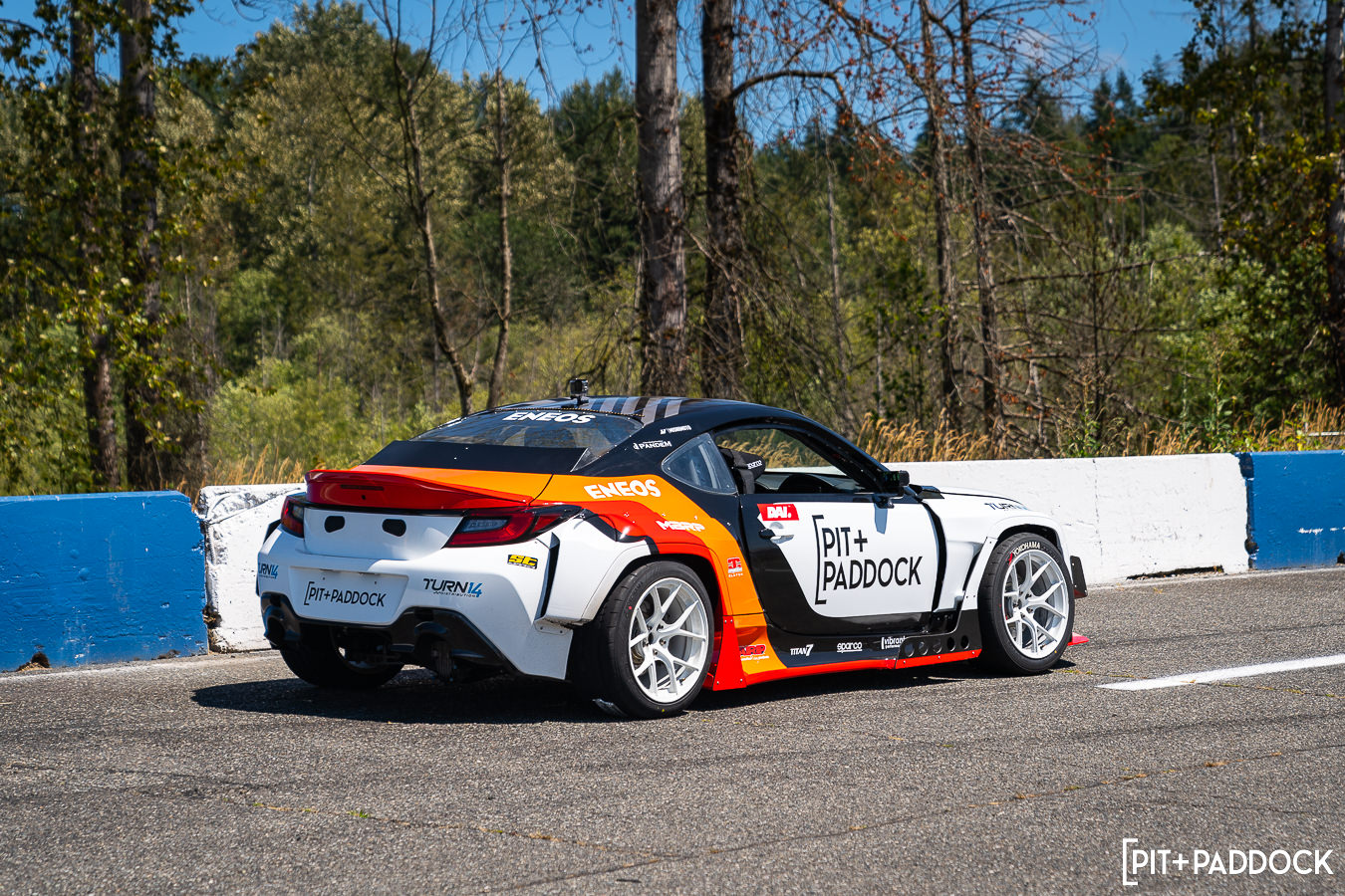 The premise behind Pit+Paddock’s “Ride with Dai” experience is simple: convert Dai’s 1,000hp Subaru BRZ comp car into a demo vehicle which would be strictly used to give fans drift ride-alongs. Dai and his team at Eimer Engineering spent the offseason updating the LS-powered coupe with a tube frame front chassis, double A-arm suspension, and 2nd-gen BRZ facelift with Pandem widebody. And since it was our idea, you can guess what we did with the livery next…