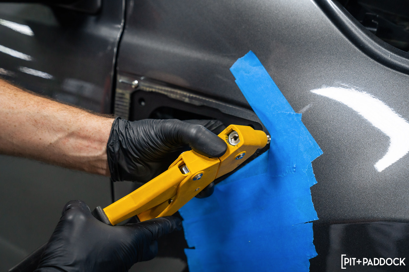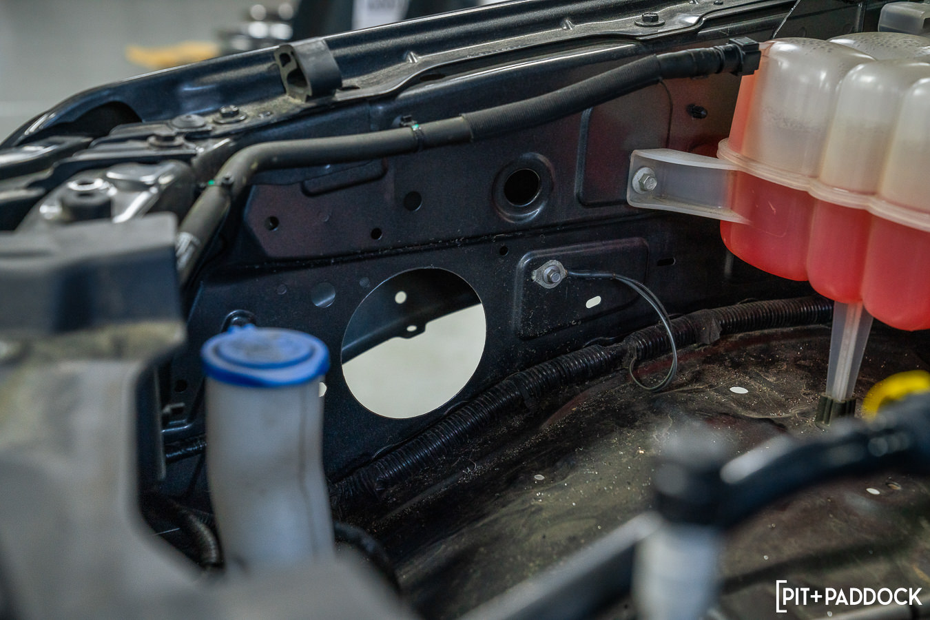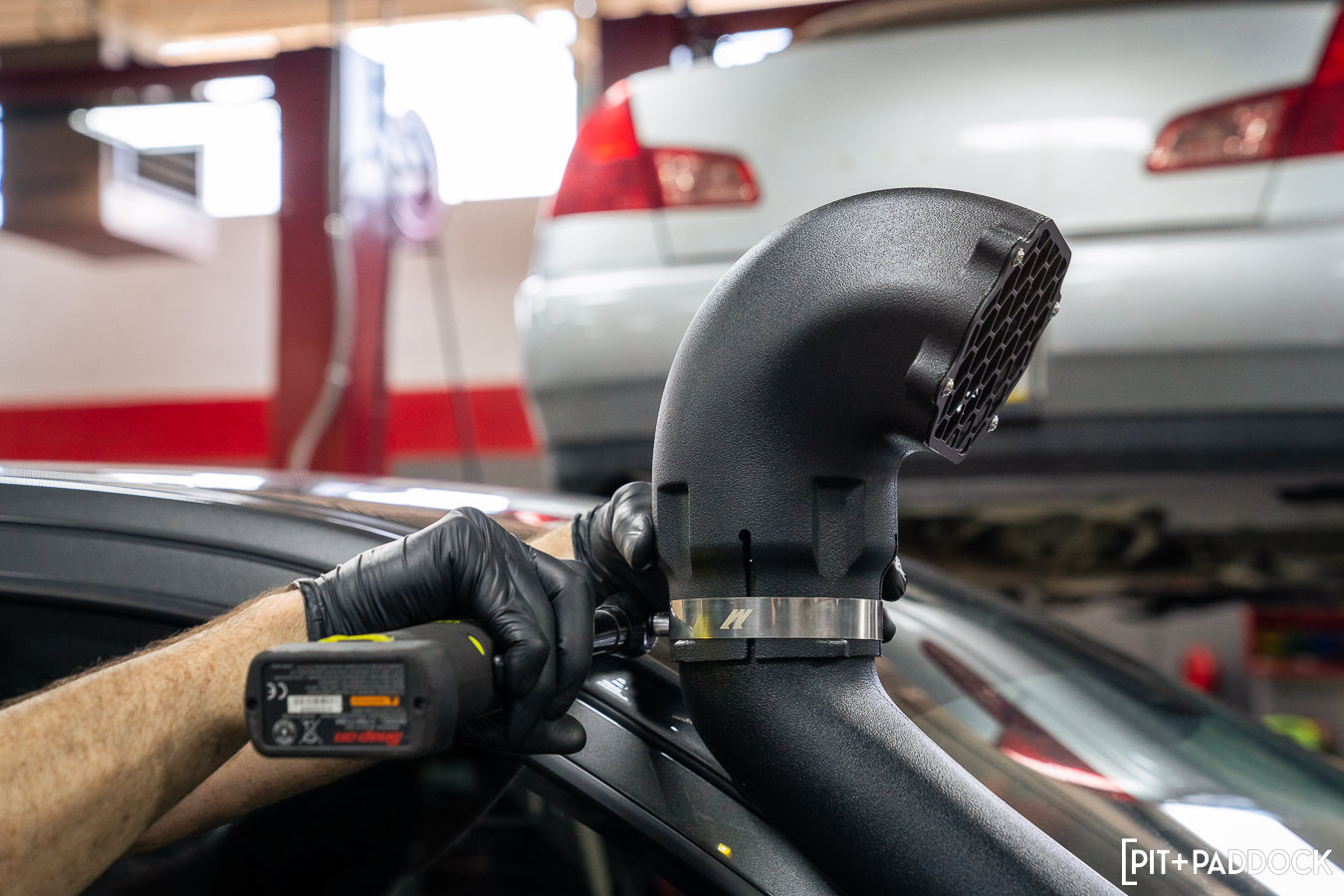 Moving onto the snorkel briefly, Pat from R/T Tuning removed the fender trim and guard to access inside the fender area. With those items removed, he could prep for the snorkel attachment by drilling holes in the fender (behind the trim badge) and the Mishimoto intake box, according to the template provided. Drilling the intake box will require a sizeable four-inch hole saw. This tool isn’t too common in everyone’s arsenal, thus raising the level of this installation.