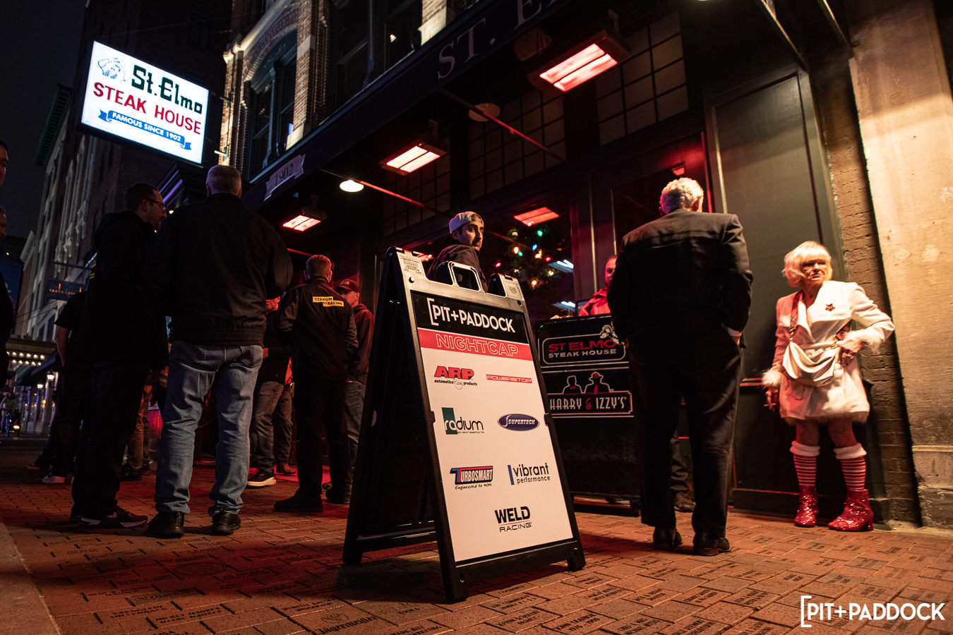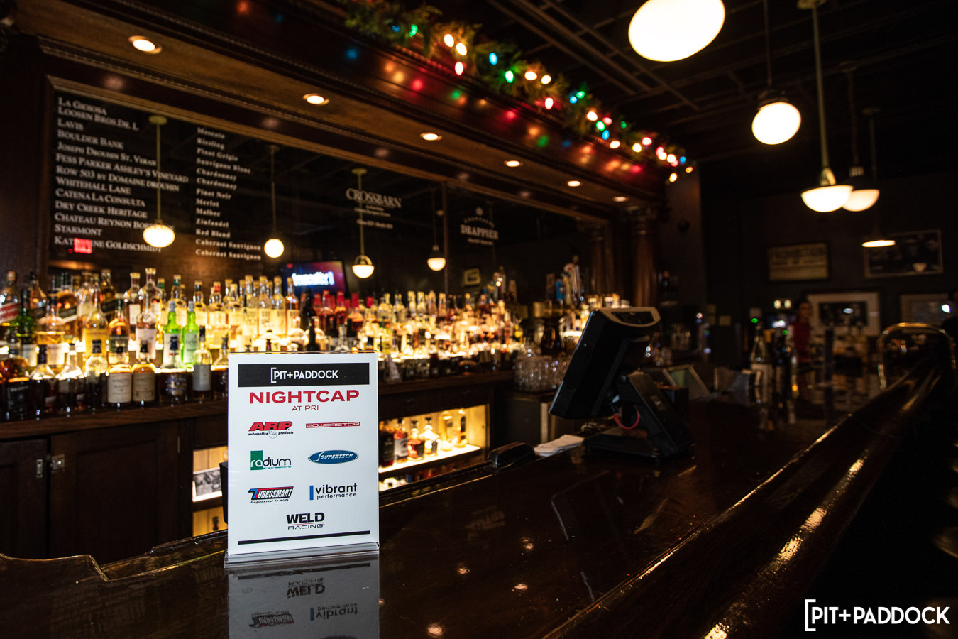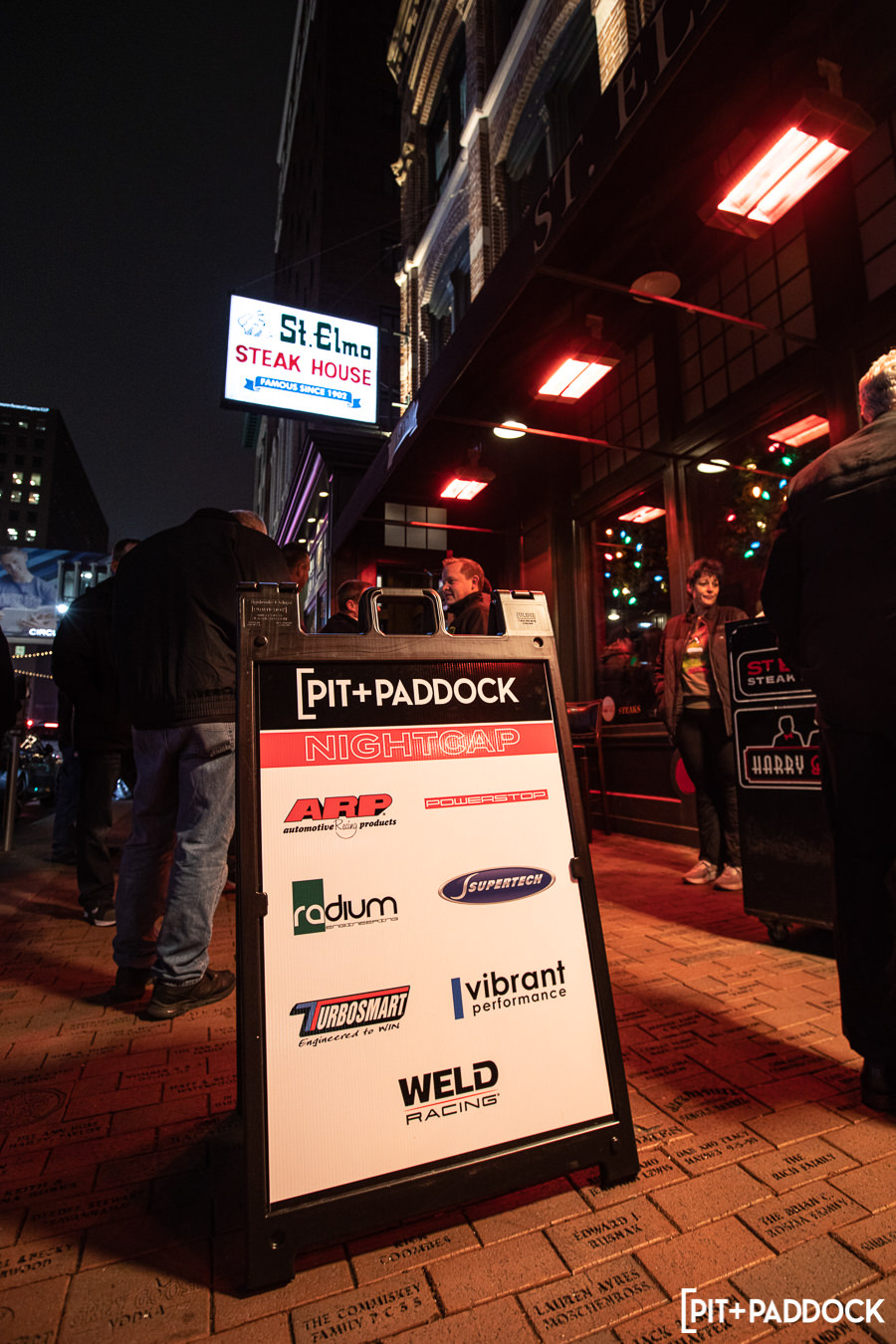 On Friday night, the team at Pit+Paddock took over the 1933 Lounge that sits atop the world-famous St. Elmo Steakhouse. Presented by ARP, Powerstop, Radium Engineering, Supertech, Turbosmart, Vibrant Performance and Weld Racing, the Nightcap encapsulates everything we loved about Turn 14 Distribution Industry night, but in the intimate atmosphere of the 1933 Lounge. The speakeasy-style ambiance with a restored vintage from the 1800s sets the tone, not to mention the shrimp cocktail appetizers are considered one of the best in the country. For anyone that’s been to PRI in the past, 1933 Lounge is legitimately the go-to hot spot during PRI week, even with its minimal capacity, but the classy yet inviting vibe is unmatched in a city like Indianapolis. Unlimited cocktails, tasty desserts, and a few fun raffle prizes made this night one for the books for our exclusive VIP guests. Our friends at Turbosmart were generous enough to spread some holiday joy by giving every guest a fresh black hoodie adorned in both the Turbosmart and Pit+Paddock logos.