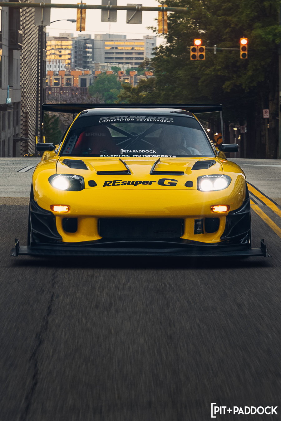 Fourteen years later, the car assumes a more familiar form to all of us — gleaming in Mazda’s OEM Sunburst Yellow paint (from the RS-R 30th Anniversary and Bathurst R Editions), full RE Amemiya aero, and about a billion other parts that create a perfect circuit-inspired vision.