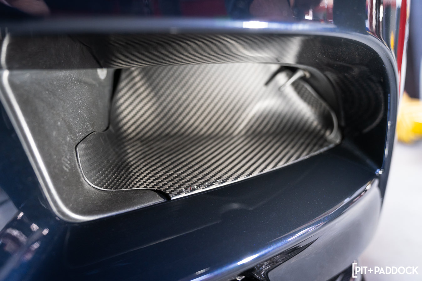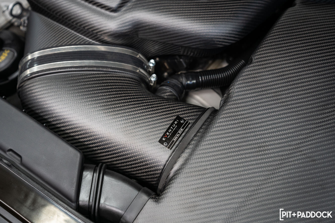 Similar to our previous chapter where we focused on several interior enhancements, the Eventuri suite installs with predictable ease since dimensionally, each carbon fiber component is identical to OEM, even down to the factory mounting points. A few extra ticks of time were devoted to ensuring the silicone hose coupler was properly seated against the plenum and that the debris shield was adequately oriented (downward) within the factory airbox base. Some care should be taken to ensure you install the carbon inlet scoop beneath the OEM temperature sensor in the bumper opening.