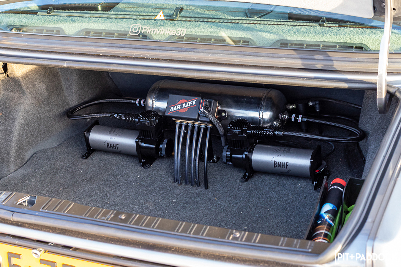 As a BMW purist, I lost my mind when I saw how much time Pim spent retrofitting factory equipment into his car. Outside, the car received a full once-over to remove rust and been resprayed a handsome shade of Granite Silver from BMW’s own color library. The E30 M3/Touring roof antenna was fitted, and an ever-subtle E36-inspired homemade lip adds that special something to the front bumper. Inside, the retractable roller blind in the rear parcel shelf, “high spec” map light rearview mirror, heated seats, OBC II on-board computer, and the M-Tech II steering wheel will surely tally points from BMW fans. But it’s the center console that takes the cake for me — it’s lifted from a Euro-spec M3 — and features the coveted Electronic Damper Control knob which allows you to toggle three different shock settings (Komfort, Normal, and Sport). Since this car is on air, Pim has repurposed this knob to control three different engine map settings. How cool is that?