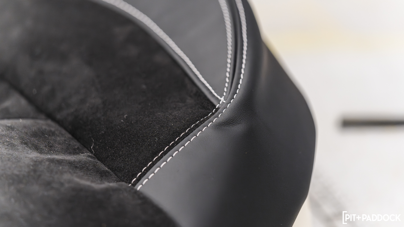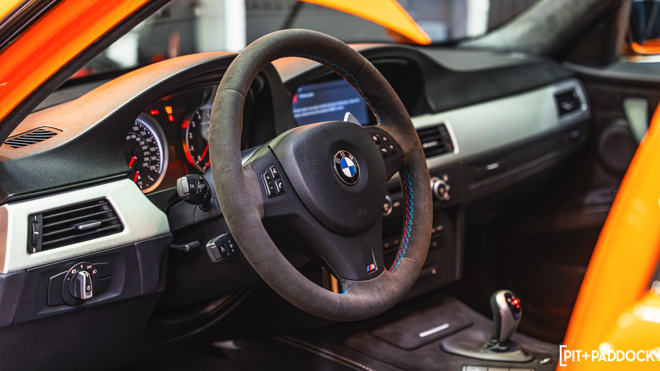 Since the true E92 M3 GTS’s steering wheel was round — in contrast to the flat-bottom M Performance variants that are readily available today — we wrapped our OEM wheel in Alcantara. We carried through the M3’s signature tri-color stitching to suit, too.