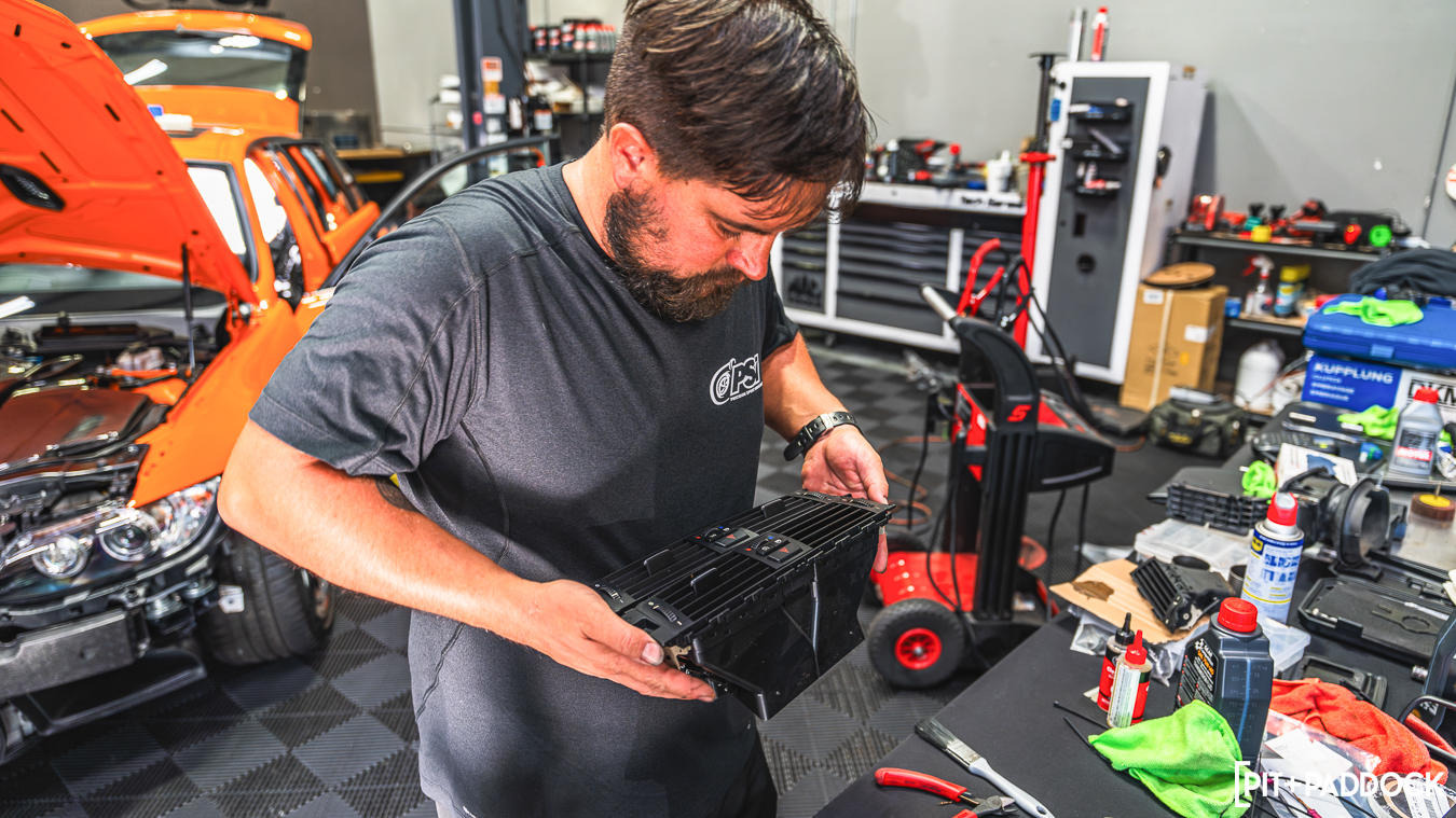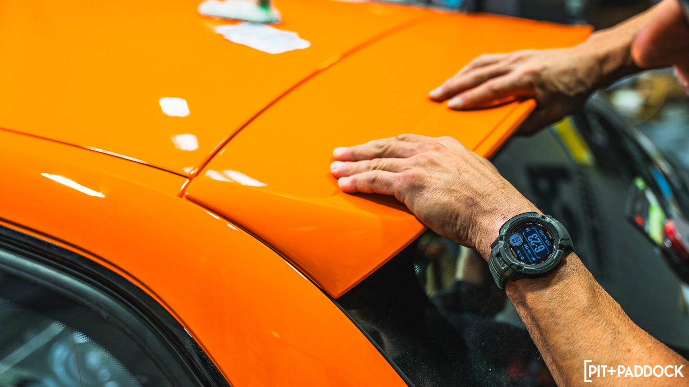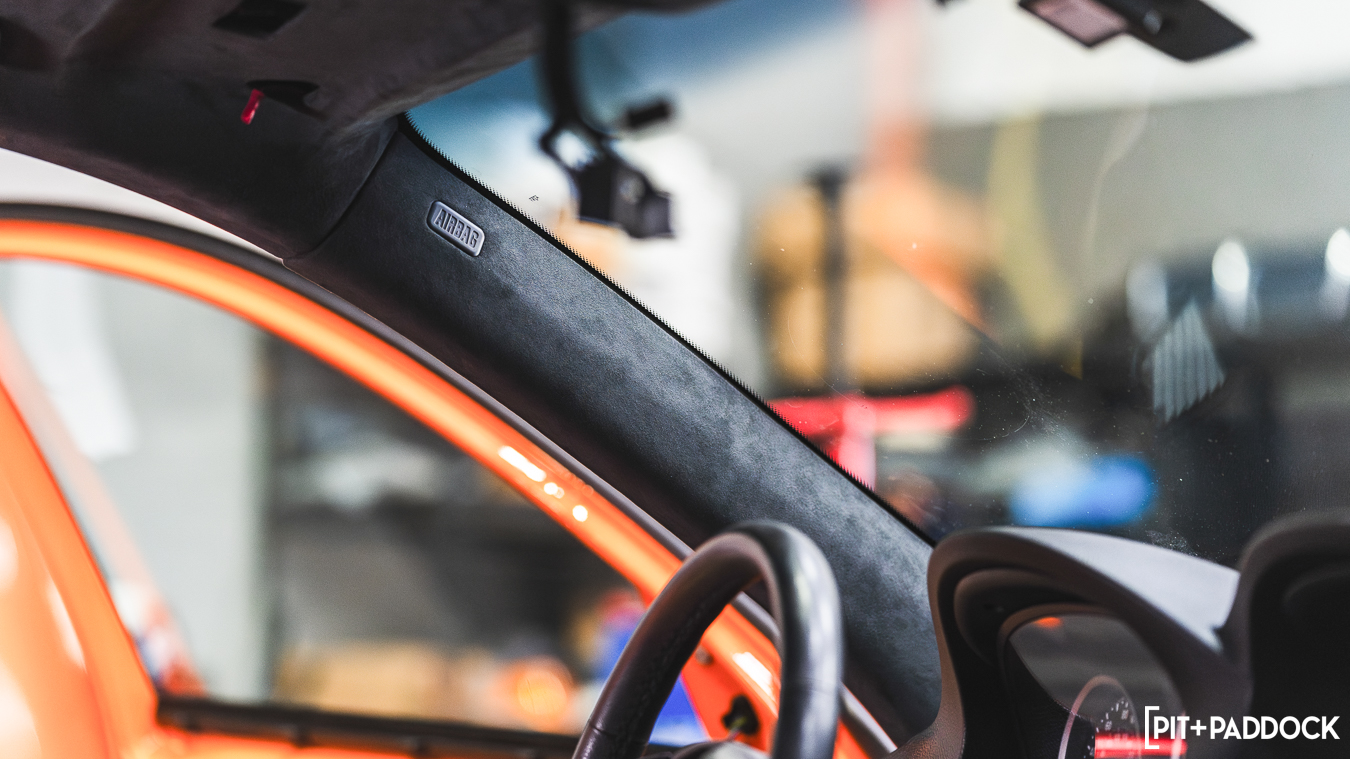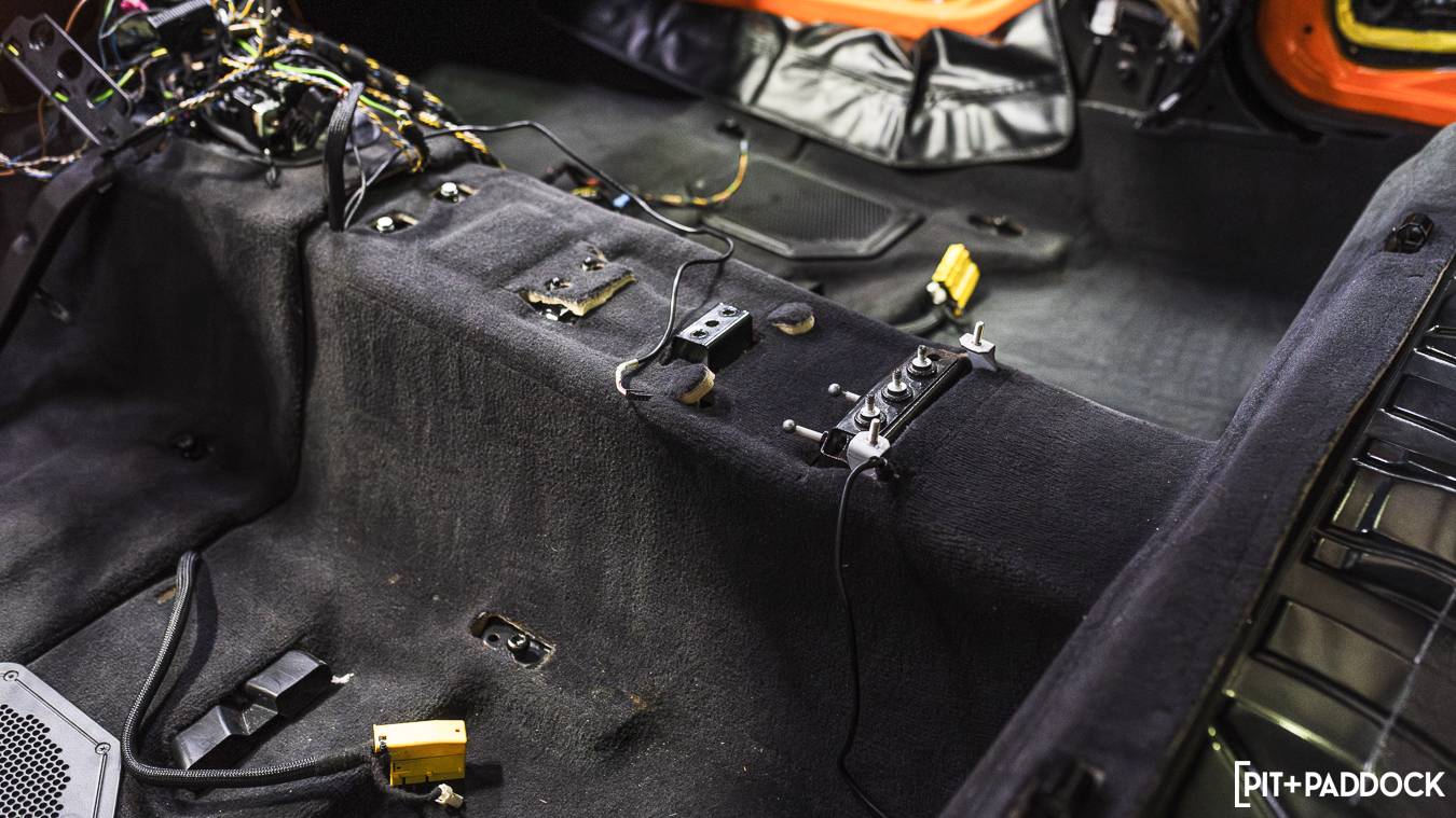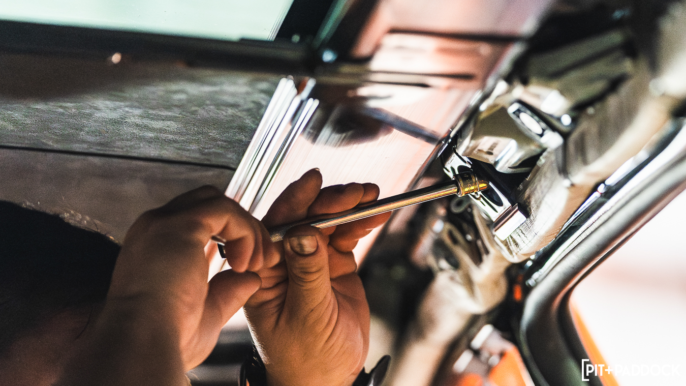 Although a majority of the attention for this round was paid to the interior, there were a handful of loose ends that still needed to be tied up elsewhere. Another round of coding from Alex at Alpine and Carbahn was first on the list, followed by exterior items like new rear quarter glass, a new windshield, Fire Orange roof rack deletes, and a fresh Fire Orange shark fin.