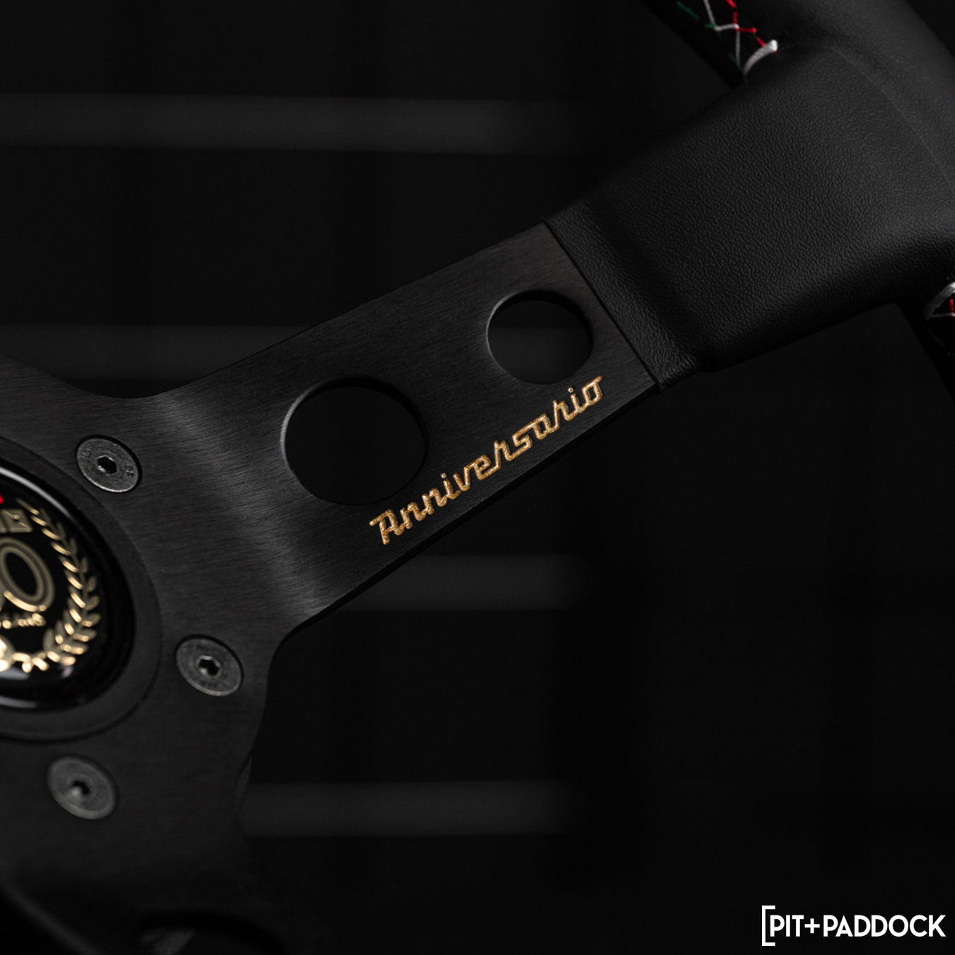 The Mod.07 Anniversario steering wheel is a 350mm, semi-deep corn design that evokes the Italian racing spirit throughout. Crafted from premium black leather and stitched with the colors of the native flag, each of the limited 100 units features a luxurious Alcantara top insert and an exclusive Anniversario horn button. I love that the 12 o’clock stripe and the brushed black anodized spokes are subtle. The treatment allows the gold Anniversario adornments to shine prominently and they gleam from every angle.