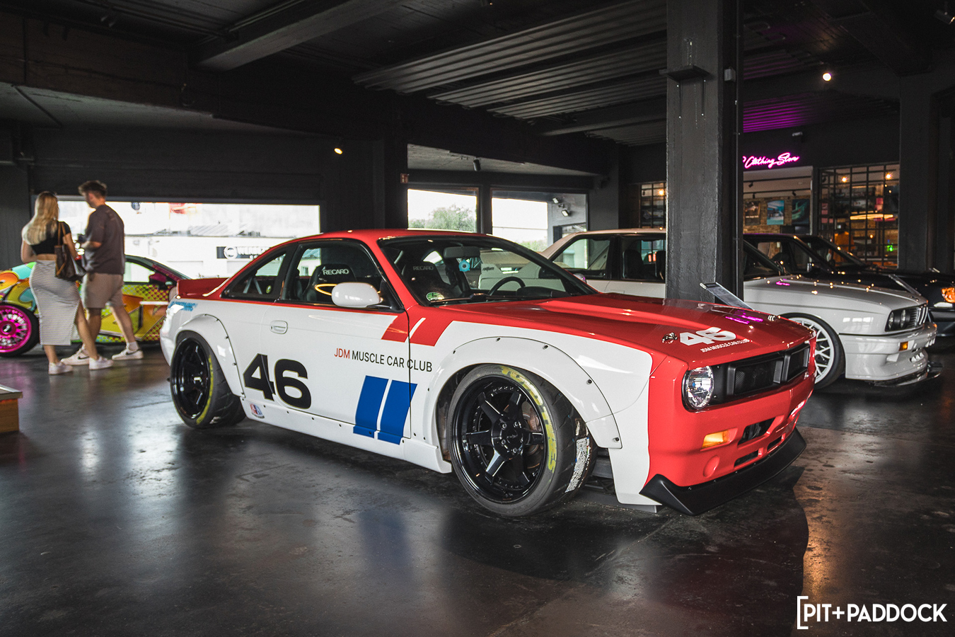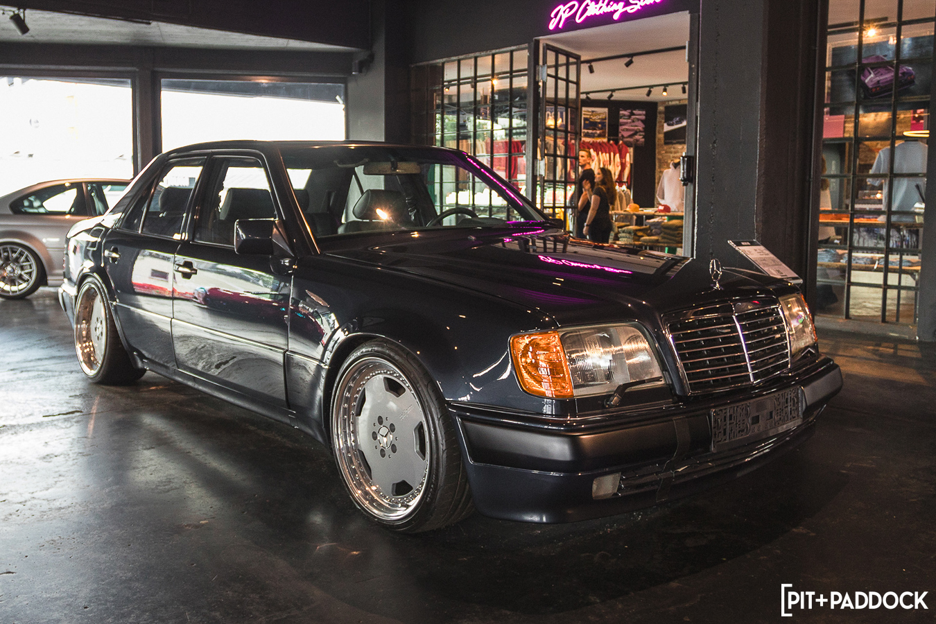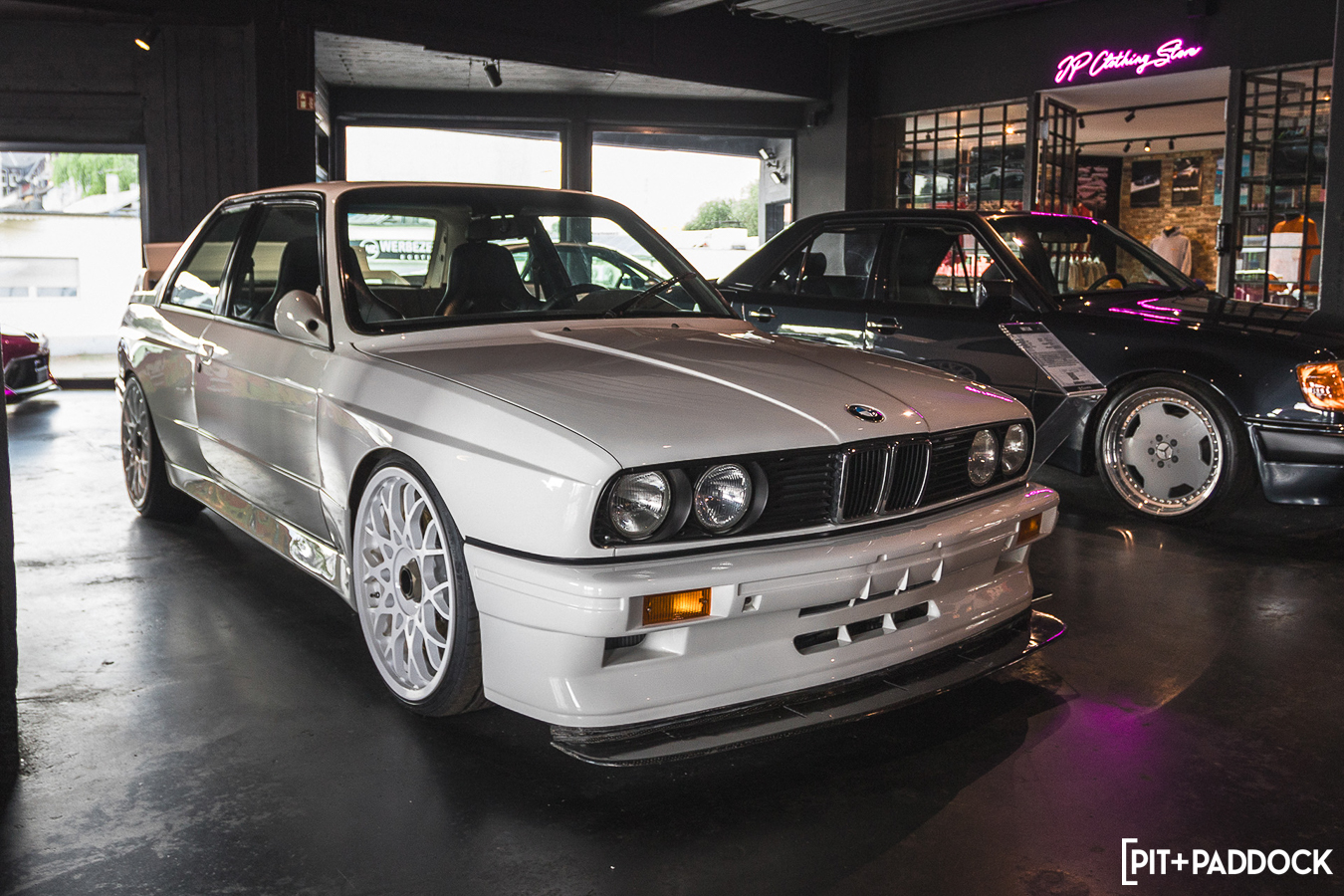 Crossing the street leads you to BBB, or Big Boost Burger, where you can satisfy your hunger and admire more cars. As expected, the menu is filled with burgers that you can customize to your heart’s content. Judging by the time and the packed seats, they’re a hit. I skipped it this time, but I can assure you they’re absolutely delicious. While you wait in line, there’s plenty to see. A real standout, in my opinion, is the sliced-in-half Golf Mk2 above the pool table, with its headlights illuminating the surface. But my favorites in BBB were JP’s cars: an S55-swapped E30 M3 and a wild V12-swapped 500E. Some may consider these creations somewhat sacrilegious, but I think they are both masterpieces in their own right.
