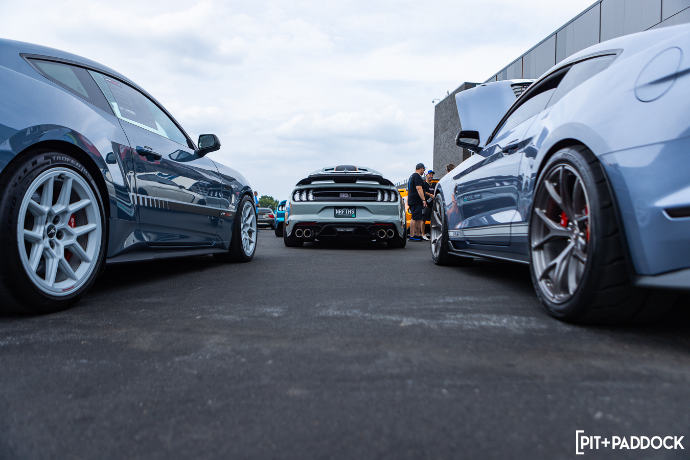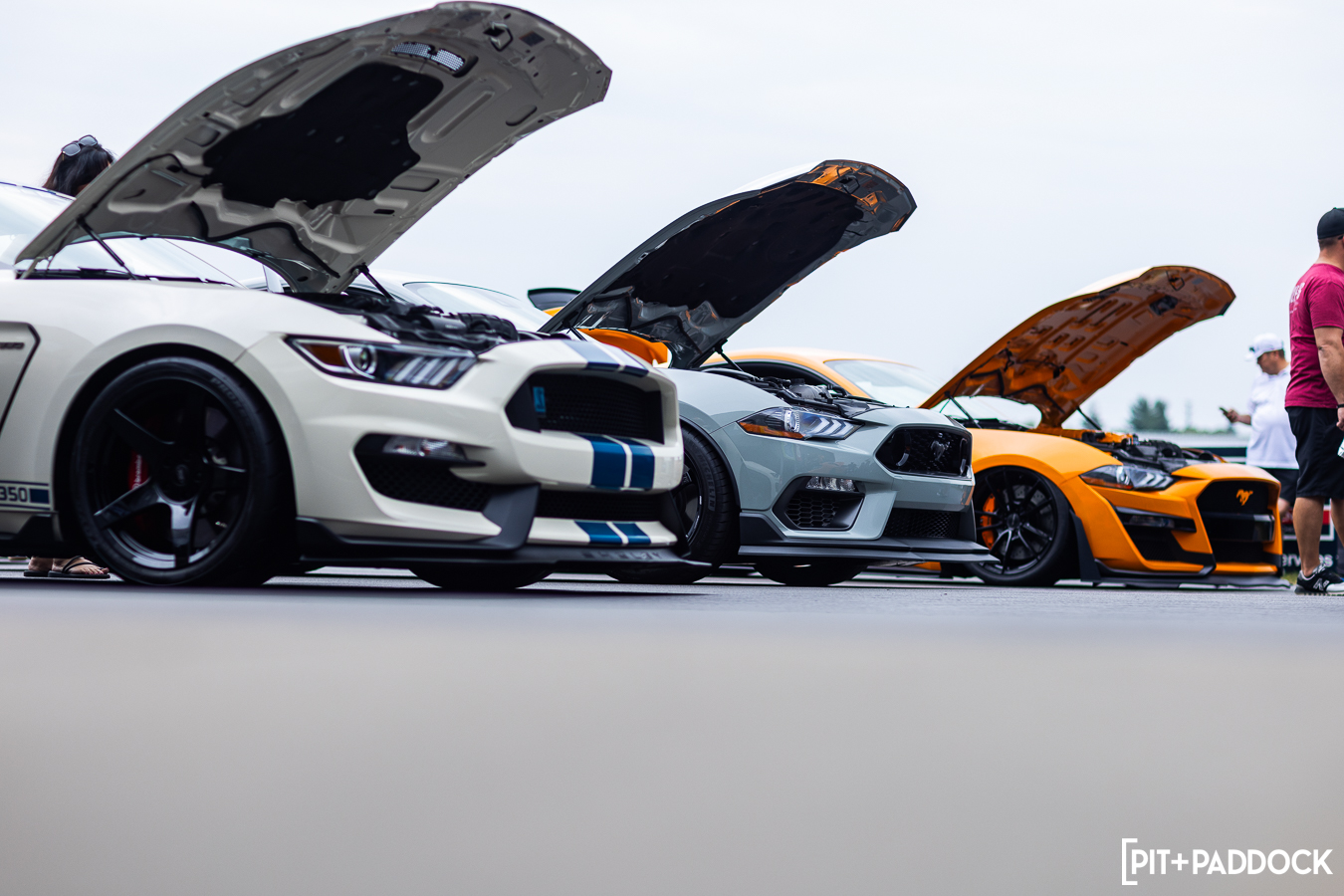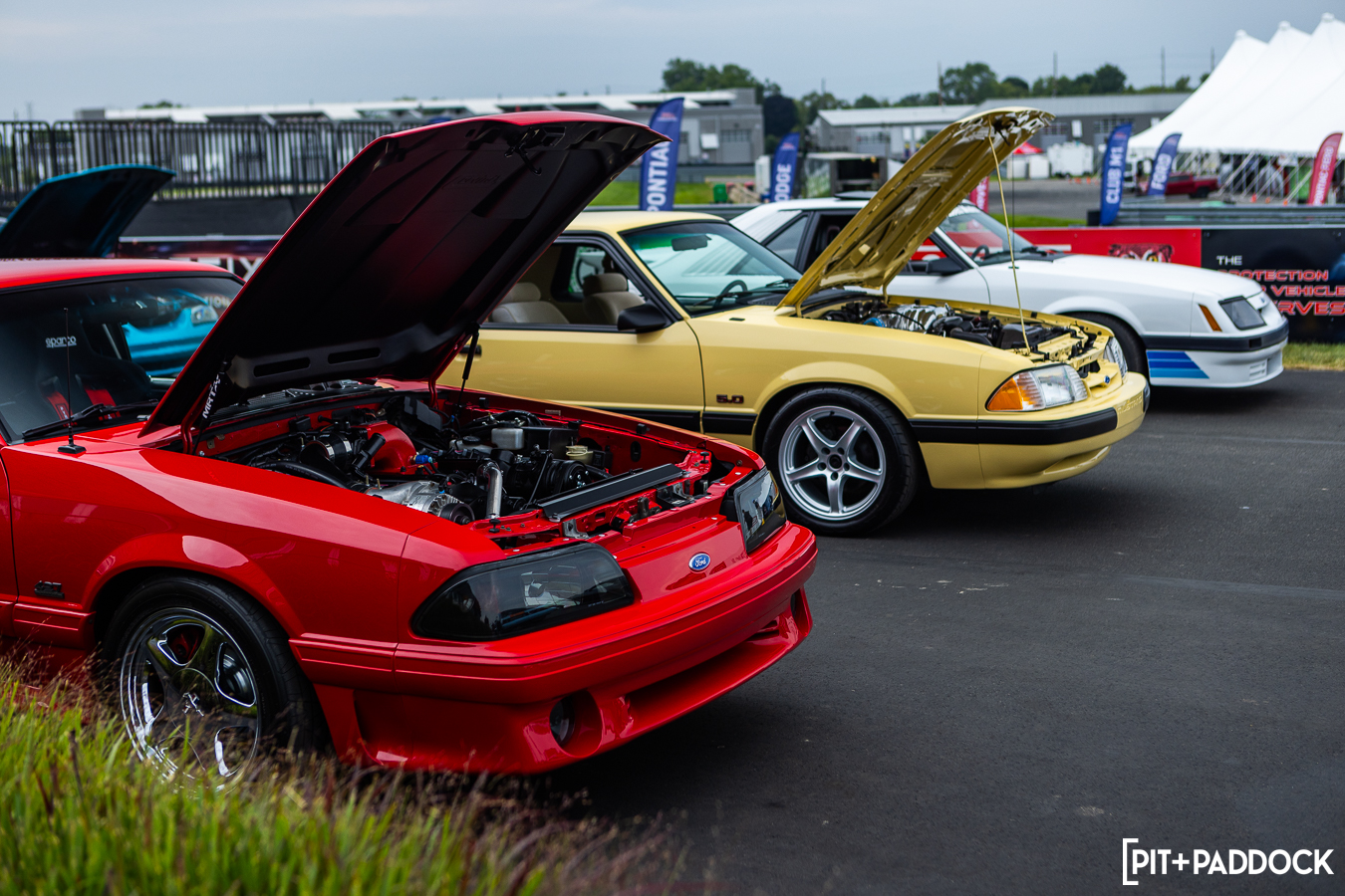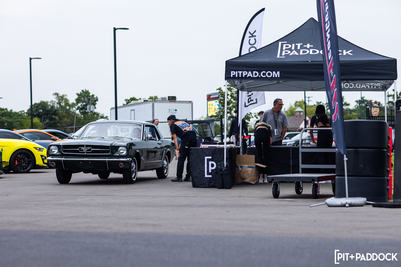 At the beginning of Pit+Paddock, we were admittedly very intentional about integrating displays that looked like starting grids; it helped us drive the point home about where our brand intersected. Since then, we can admit that it just looks incredibly cool. We lined the Mustangs up by generation—old to new—so that when spectators rolled through the gates, it’d be their first impression.