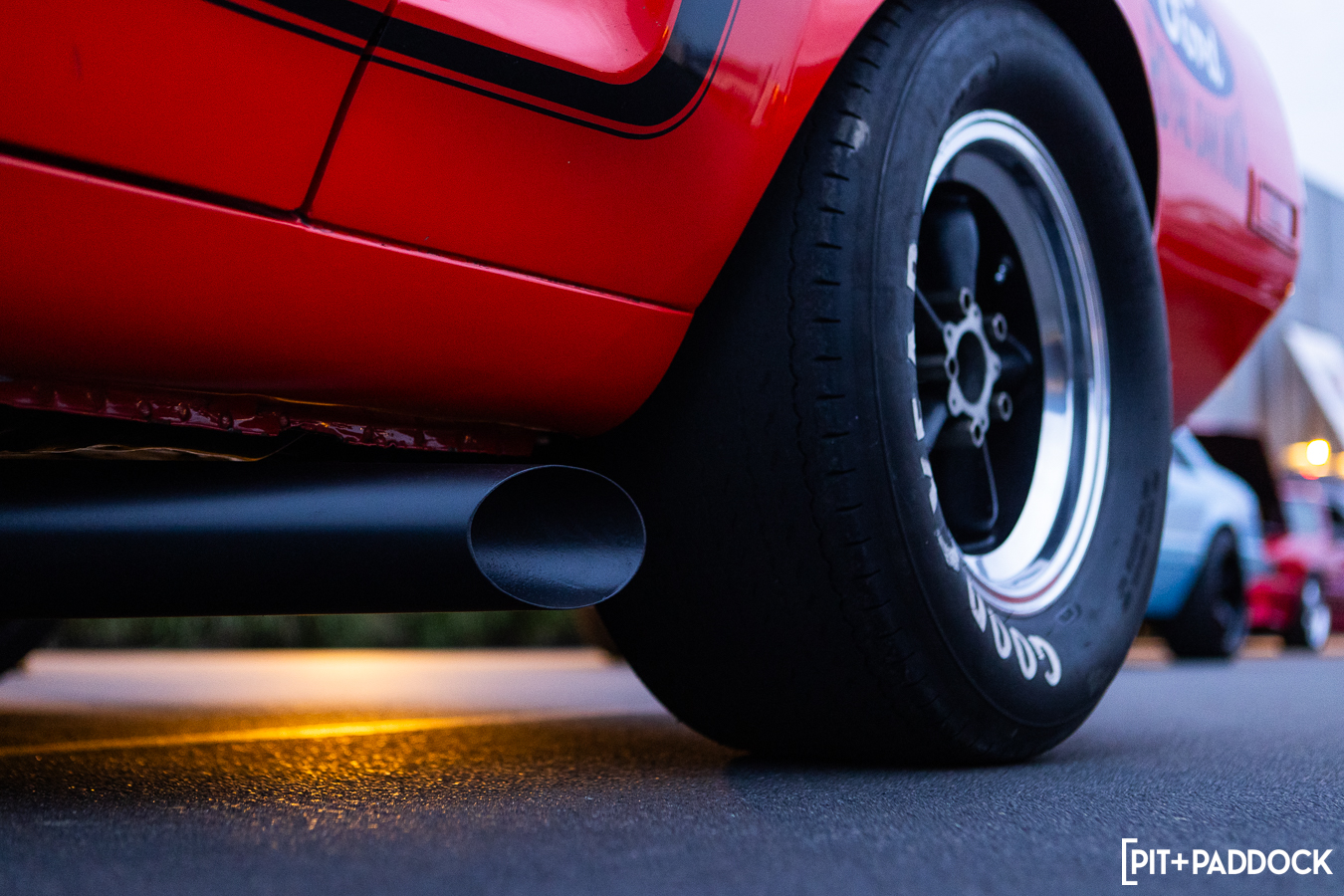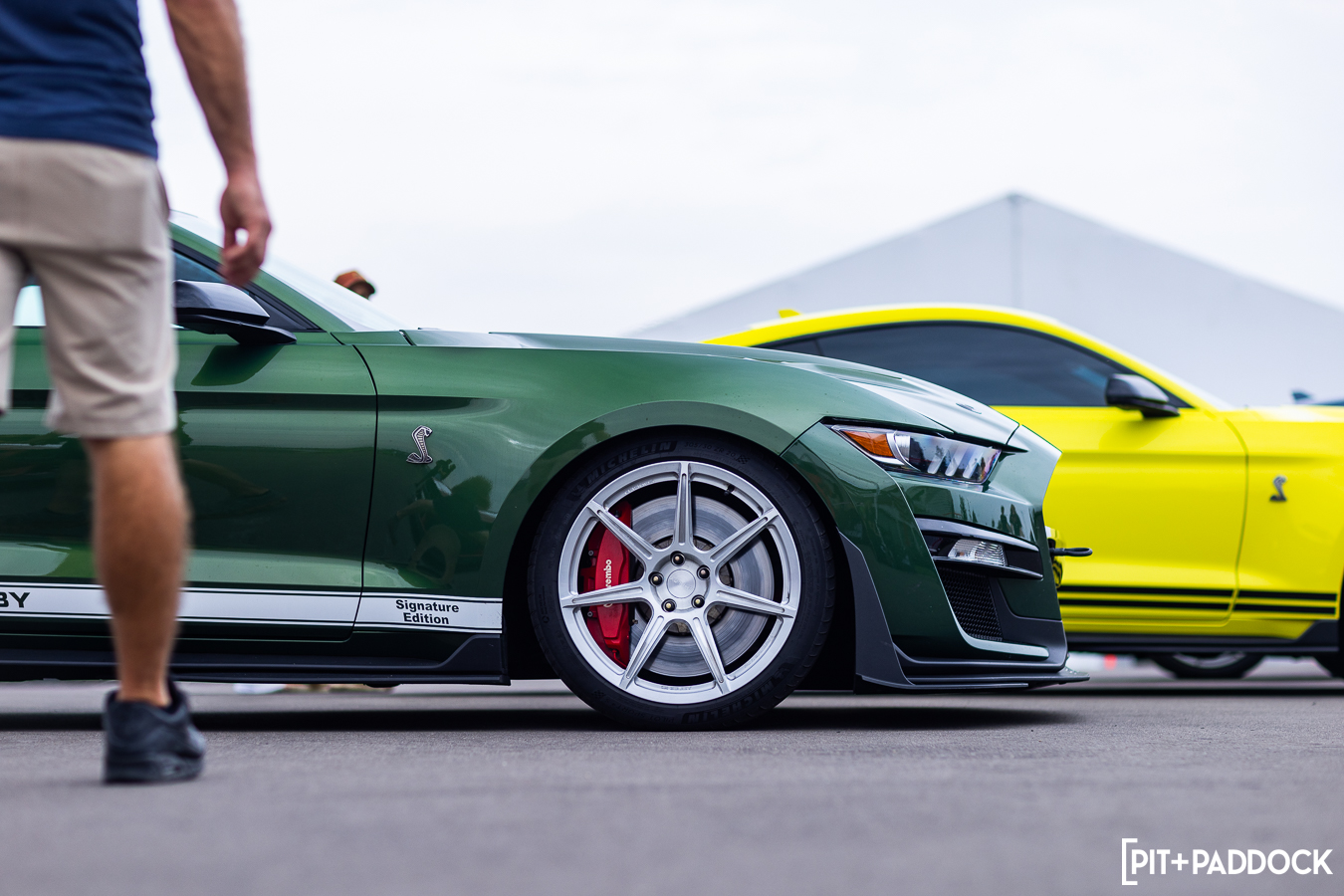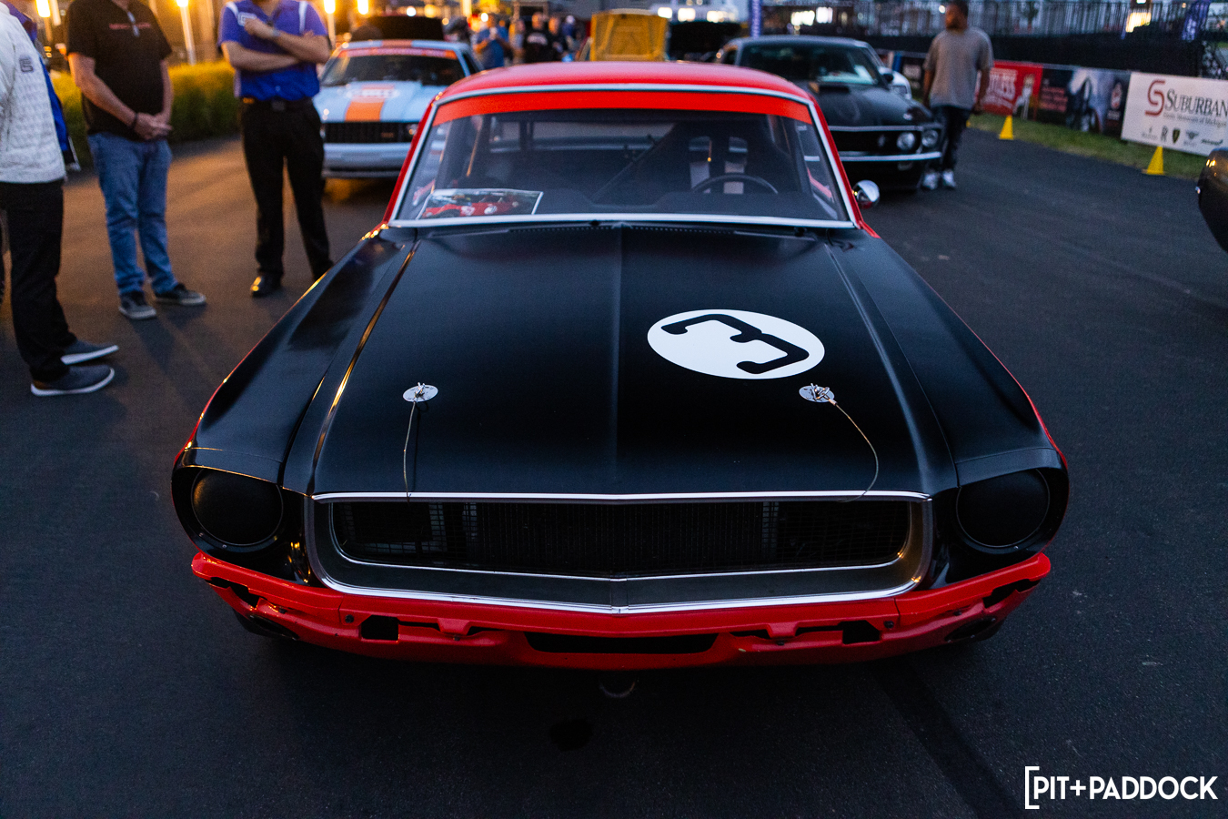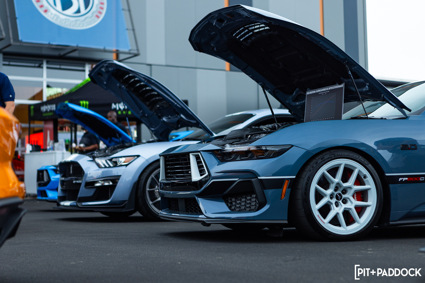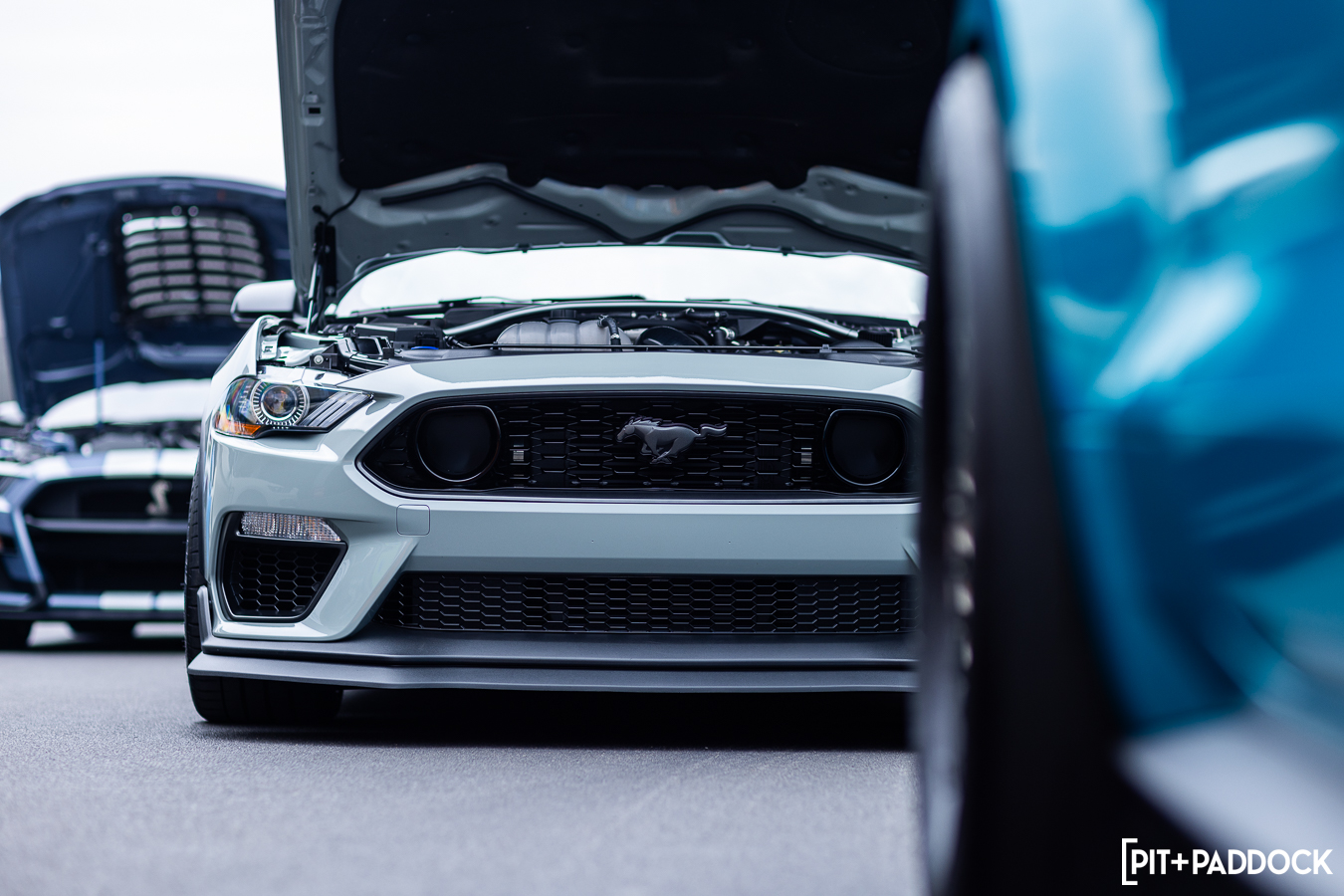 At the beginning of Pit+Paddock, we were admittedly very intentional about integrating displays that looked like starting grids; it helped us drive the point home about where our brand intersected. Since then, we can admit that it just looks incredibly cool. We lined the Mustangs up by generation—old to new—so that when spectators rolled through the gates, it’d be their first impression.
